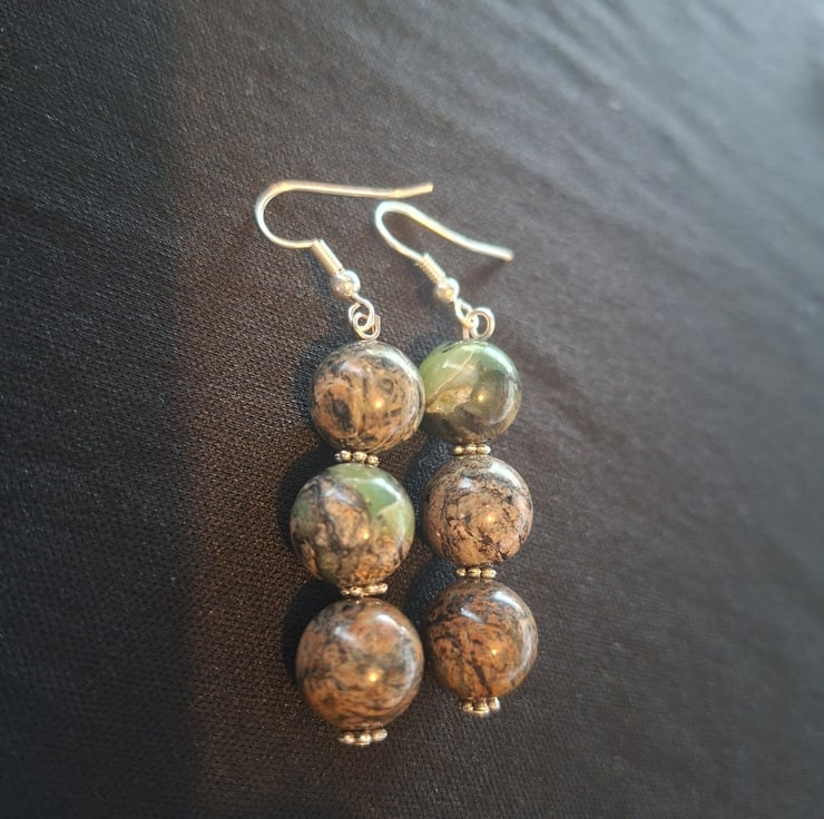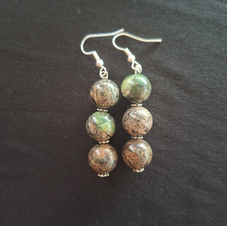 Handmade earthy style glass bead earrings. Drop style with sterling silver plated hooks.