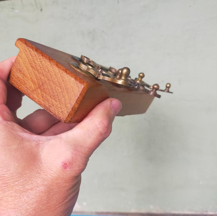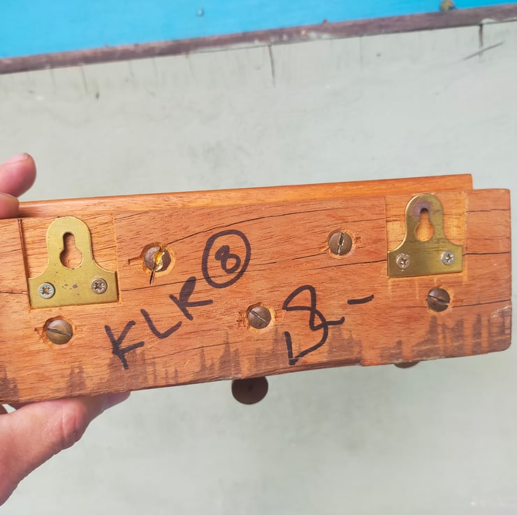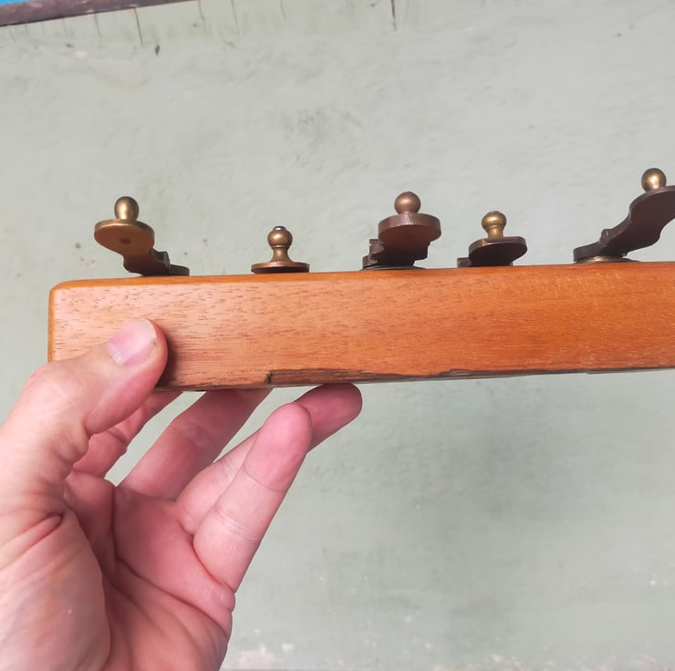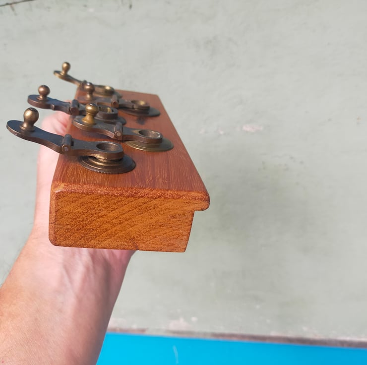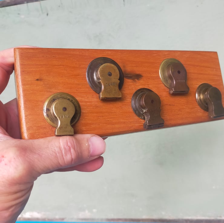 If you are of a certain age, you will remember the big leather tape measures brought out on sports days, with their elaborate brass mechanisms for winding the tape back in. These racks are all crafted from a solid block of reclaimed Brazilian mahogany, into which the winding mechanisms have been embedded, many with their embossed leather surrounds, to create a characterful and distinctive piece of retro home furnishing that will be a talking point for all your guests. Brass on mahogany is a classic look, evocative of our seafaring history; throw in some well worn embossed leather and I think you have a beautiful combination. Add to that the knowledge that these tape measures have had a long life measuring out the long jumps and javelin throws of British youth, and you have a beautiful and evocative addition to your home. Of course the actual tapes themselves don't go to waste, as can be seen from my door screens. I have used mirror slots as a hidden fixing and given them a clear wax finish.