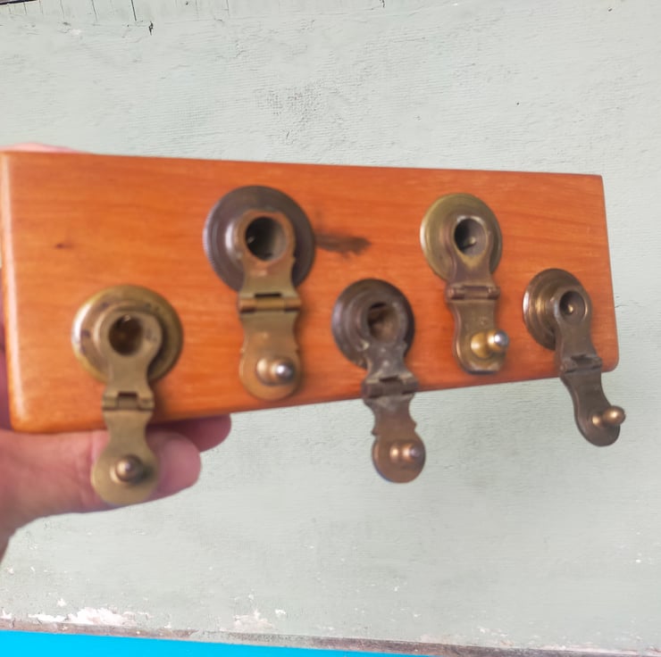 Keys and letters, of course, but maybe utensils, tea towels, condiments, phones, earphones, jewellery, whatever you want to hang from the brass or put on the shelf.