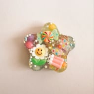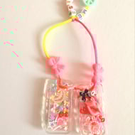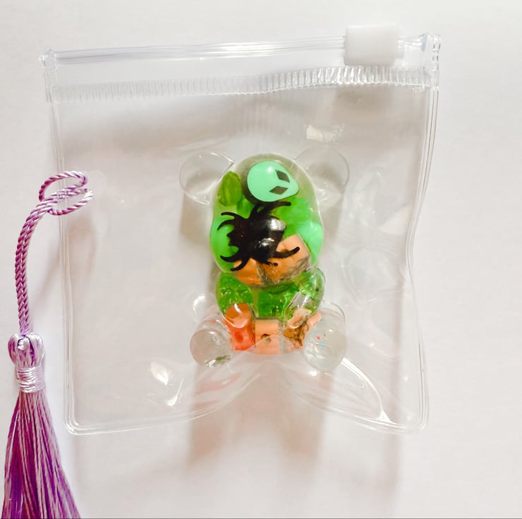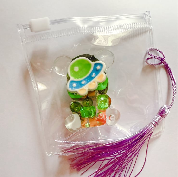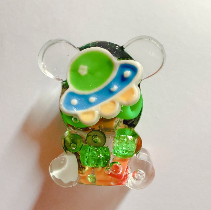 The Halloween worry bear. Full of tiny pumpkins, glowing ghosts and a chunky UFO charm on his back for a softer feel.