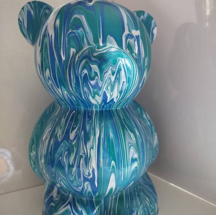 A striking hand-poured acrylic fluid art sculpture in the shape of a bear. This is a one-of-a-kind piece featuring a flowing mix of blue, teal, green and white tones. Reminiscent of ocean waves and water patterns. Each swirl is unique, making this an original decorative piece.