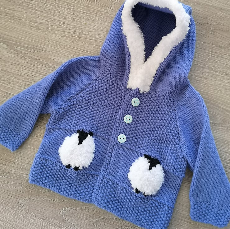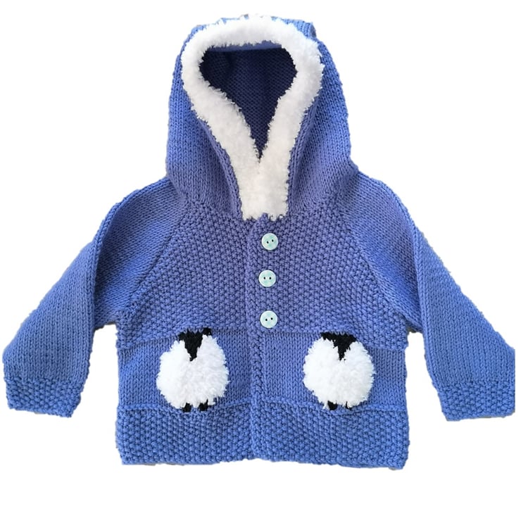 Soft and fluffy sheep feature on this Hoodie. Easy to knit in moss stitch and stocking stitch with the garment knitted in one piece up to the armholes. The sheep are knitted on the fronts and back of the jacket and is a great pattern for trying your hand at intarsia knitting (picture knitting). Instructions are given in the pattern.