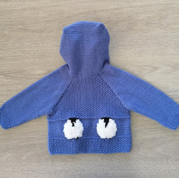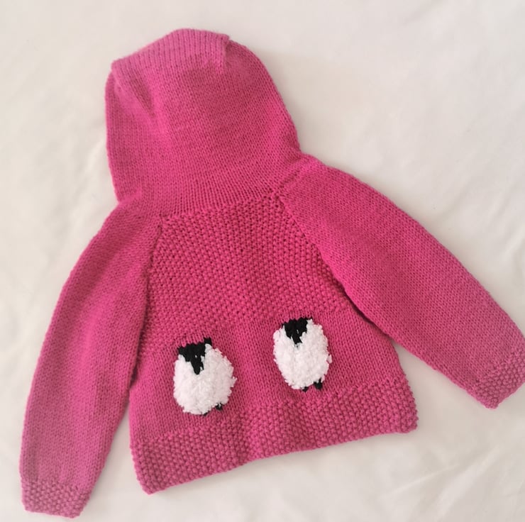 Knitting pattern for a Child's Sheep Hoodie for ages birth to 8 years.