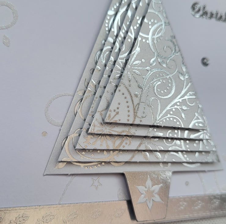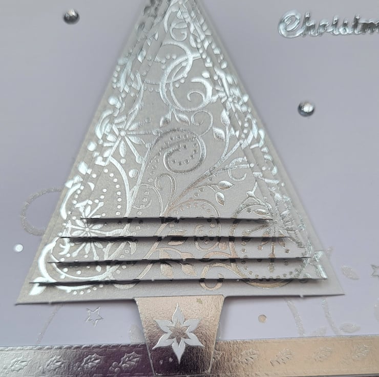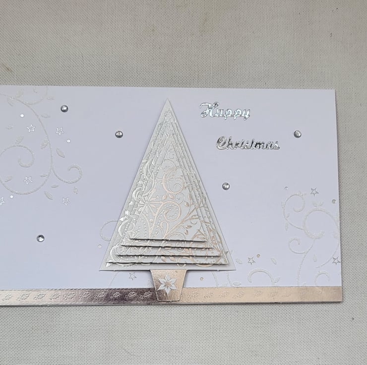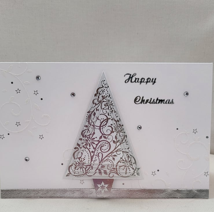 An elegant but simple Christmas card created with a pyramid 3d decoupage Christmas tree. On an embossed and foiled card. There are some diamontes dotted about to add a bit more Christmas sparkle. The sentiment Happy Christmas has been added in silver.