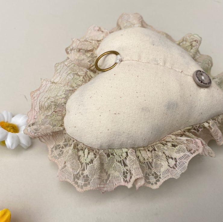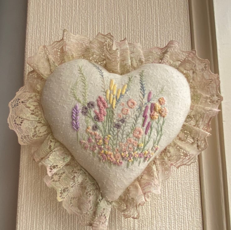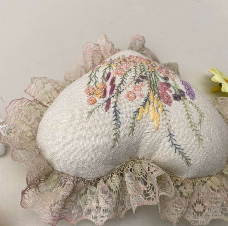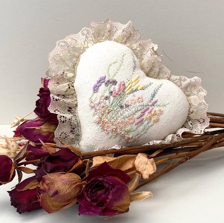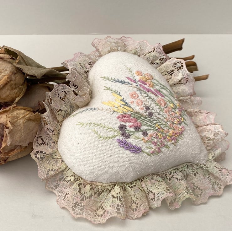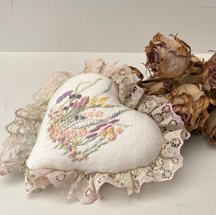 Beautiful hand embroidered ornamental heart which can be laid or hung on a wall. Nostalgia and romance, a highly detailed hand embellished stuffed heart measuring approx 5" width and length not including the lace.