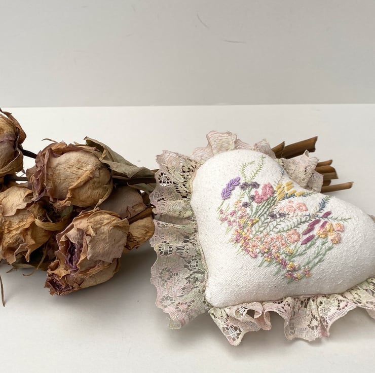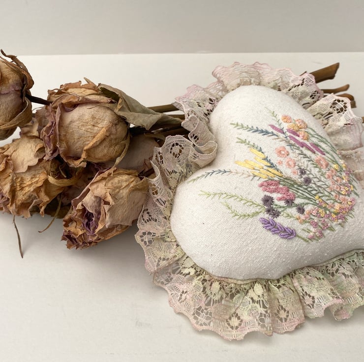 Finished with hand coloured lace, using more than a dozen shades of watercolour pencils in yellows, pinks, lilacs and greens which were continuously blended and washed until I had the desired colour to compliment the embroidery then heat set and sewn in place around the edge of the heart. It gives a lovely soft, romantic feel.