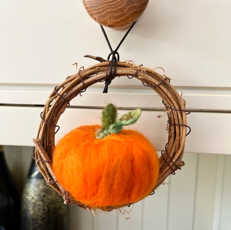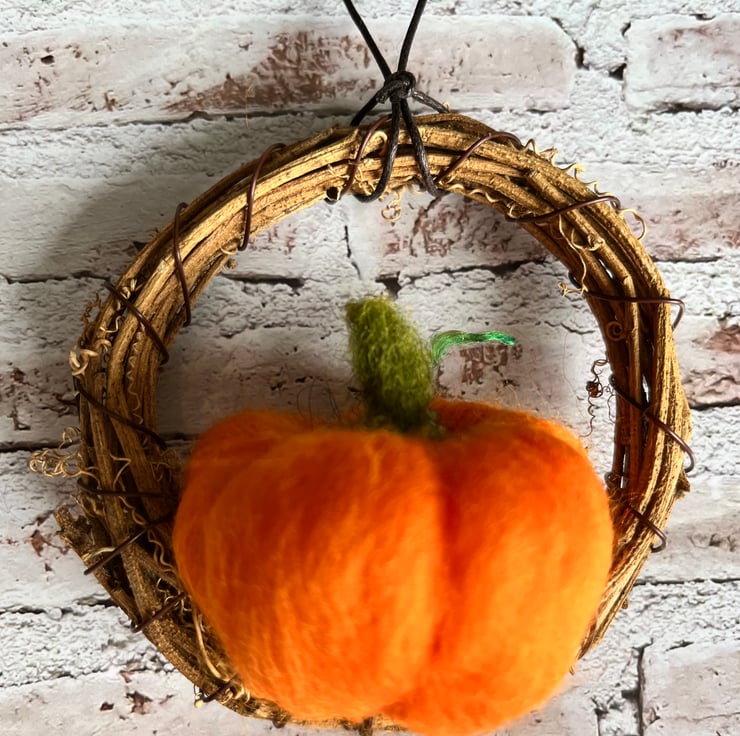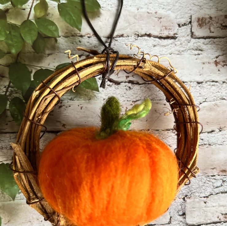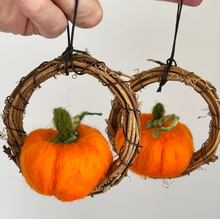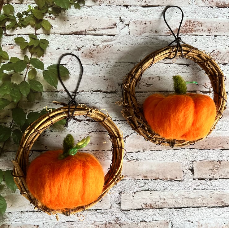 Mini pumpkin wreaths, set of two , ready to hang during the Autumn season and Halloween.