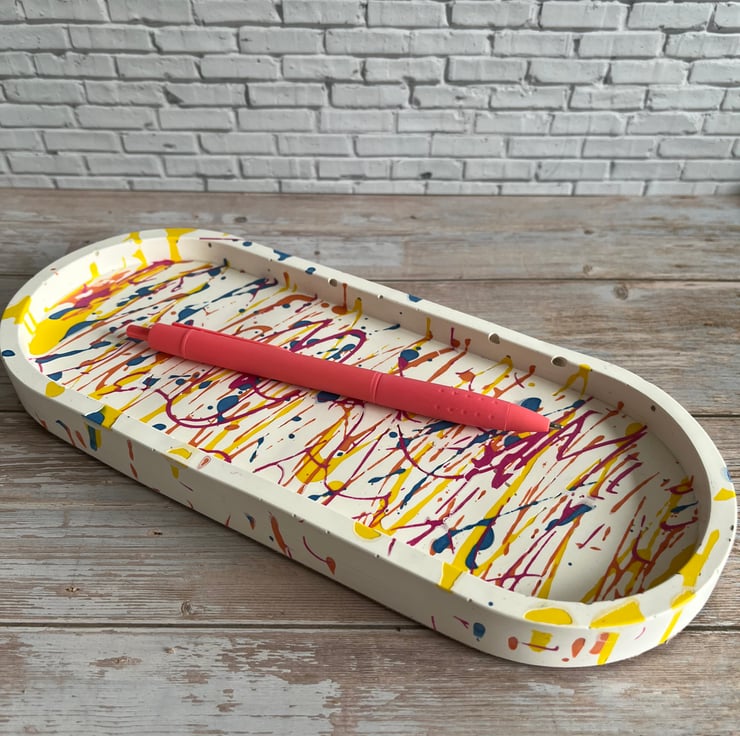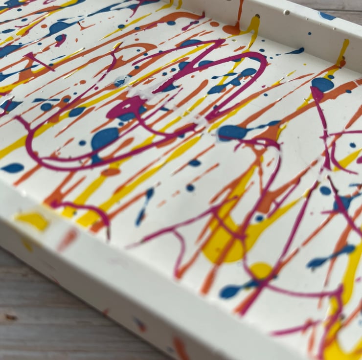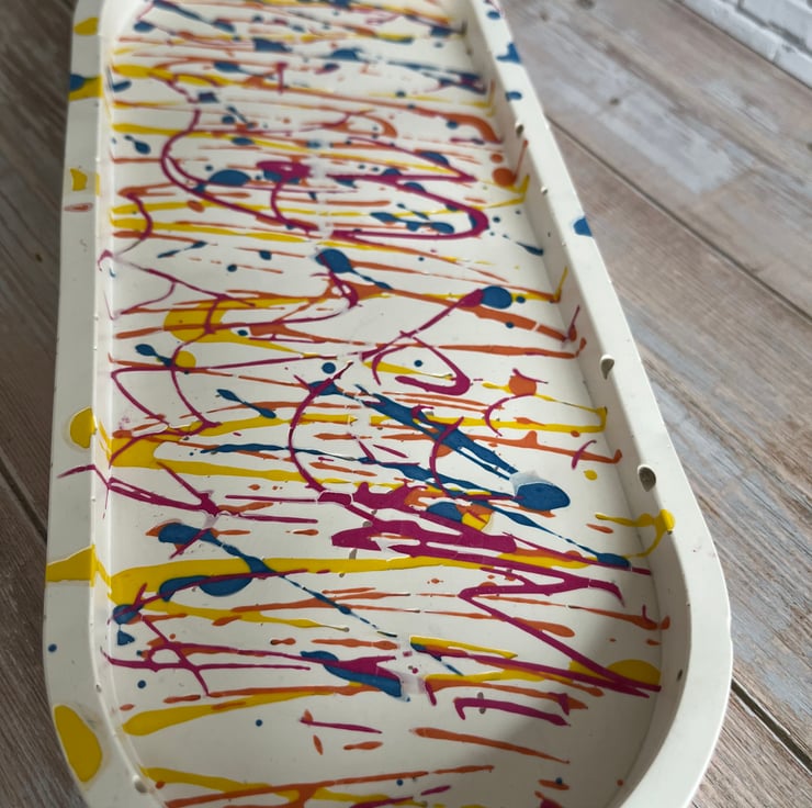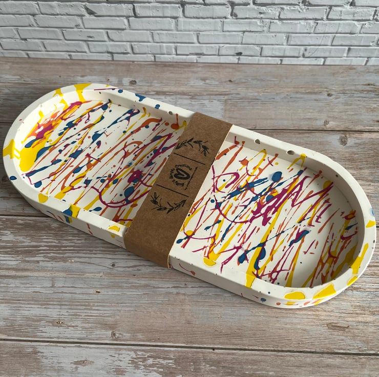 Add a burst of colour and personality to your space with this stunning graffiti-inspired trinket tray. Hand-poured in my Lincolnshire home studio using eco-friendly Jesmonite, each tray is a one-of-a-kind creation, finished with natural beeswax for a soft, subtle sheen.