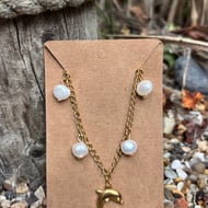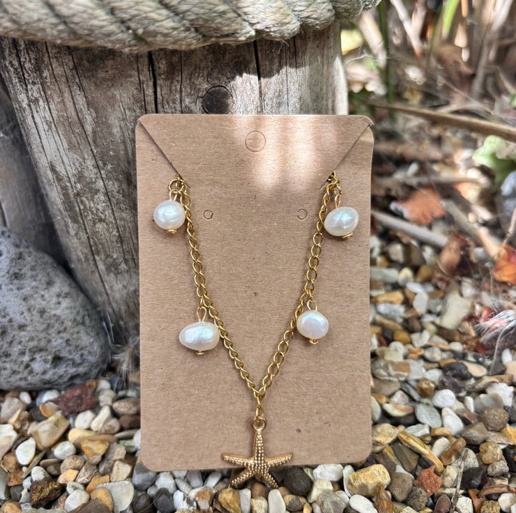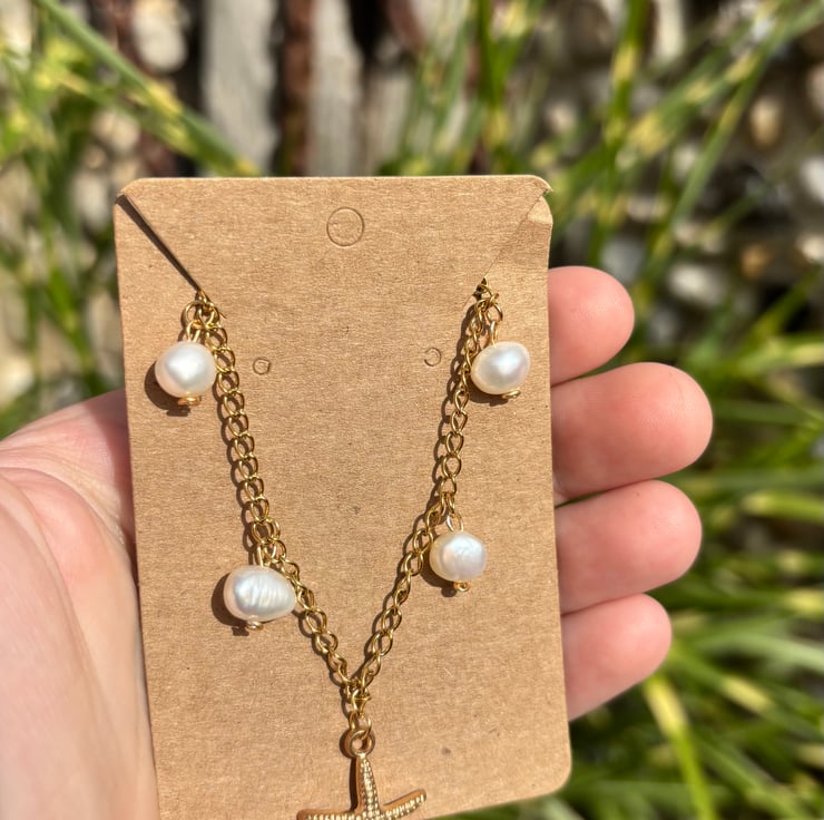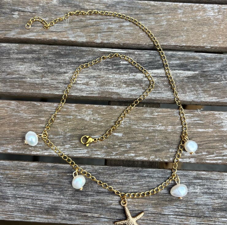 Gold Stainless Steel Chain Necklace With Starfish Pendant and Freshwater Pearl