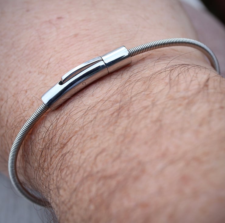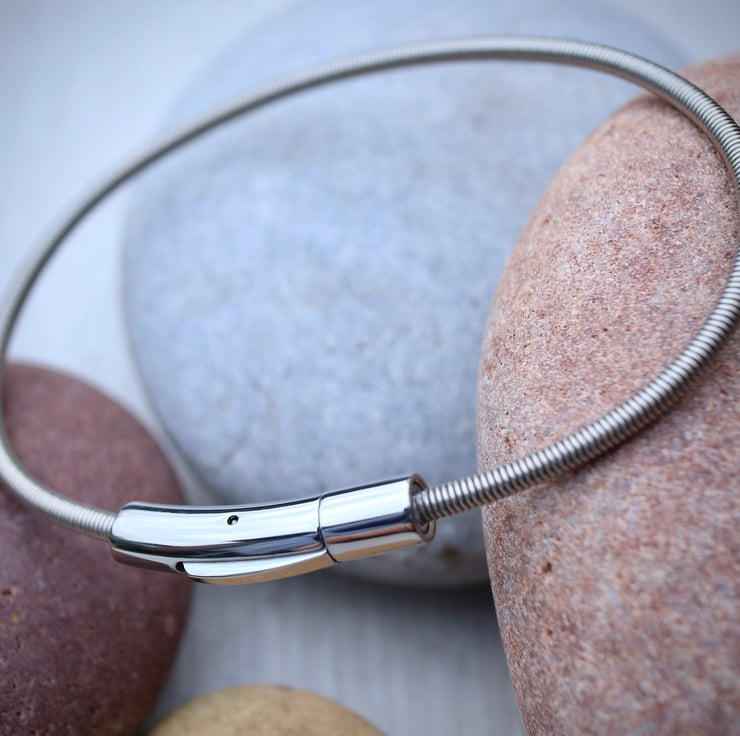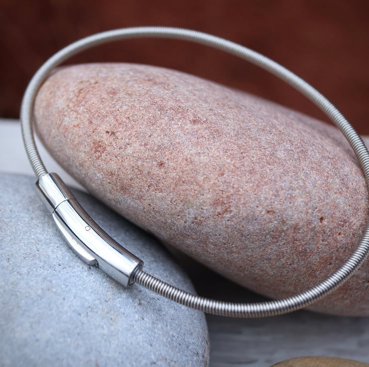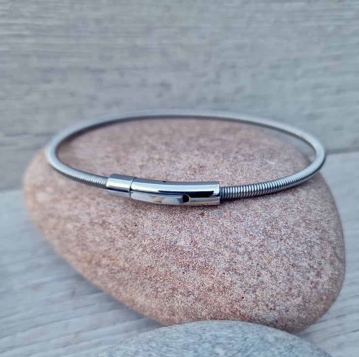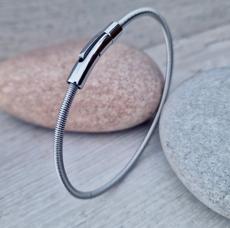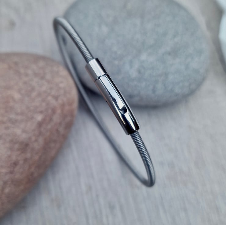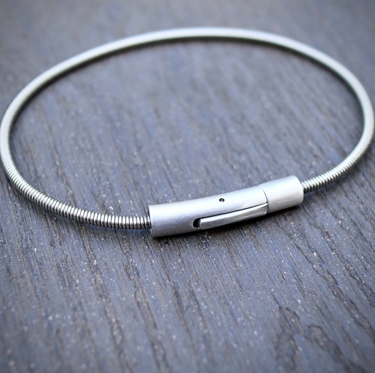 This is a sleek, custom handmade bracelet crafted from a single 2.5mm bass guitar string, finished with a bold 4mm stainless steel trigger clasp in your choice of matte or polished finish.