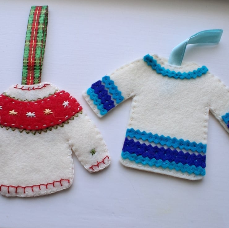 Pair of Christmas jumper decorations. Made from quality wool felt. 9.5cm high. Ribbon hanging loop. Lovely tree decoration. Lightweight and easy to store. Hand stitched by me. 2nd class postage