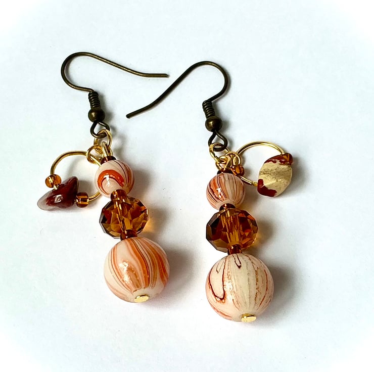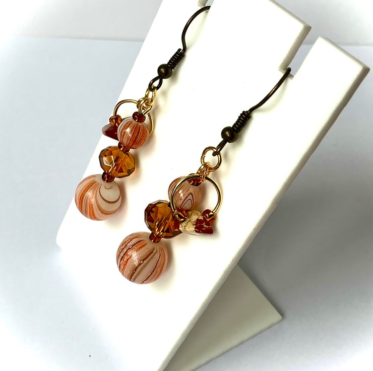 Beaded drop earrings made with Orange striped beads and faceted glass Amber coloured beads. The beads are threaded onto golden wire with the addition of a golden ring which has a rust coloured gemstone chip hanging from it.