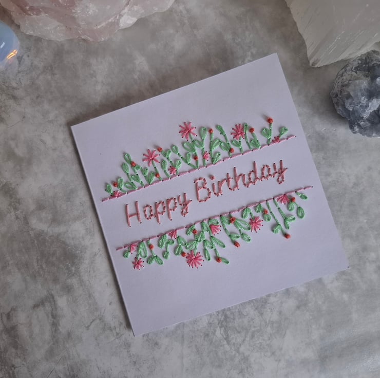 Celebrate a special day with this handmade embroidered “Happy Birthday” card. Featuring stitched lettering surrounded by pink flowers and green foliage, this unique design adds a personal and thoughtful touch to any birthday celebration.