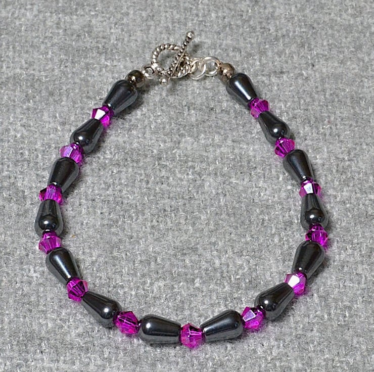 A stunningly pretty bracelet. All sparkle and shine, while maintaining a classy tone. This bracelet measures approximately 19cm, or 7 1/2 inches. It’s made with smooth, shiny, drop shaped hematite beads, and bright pink crystal bicones, and is finished with a silver-plated toggle clasp.