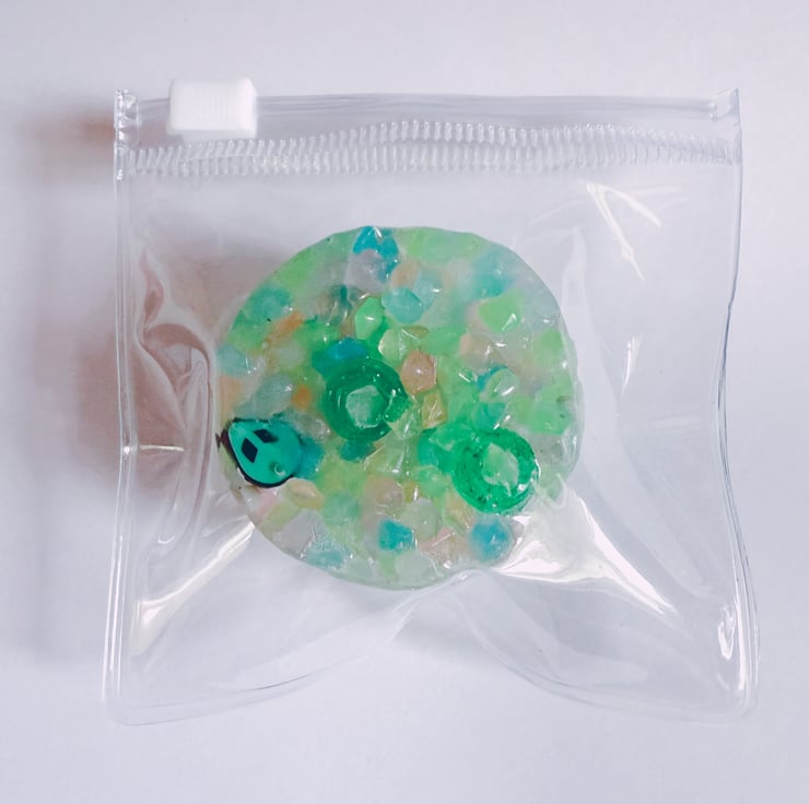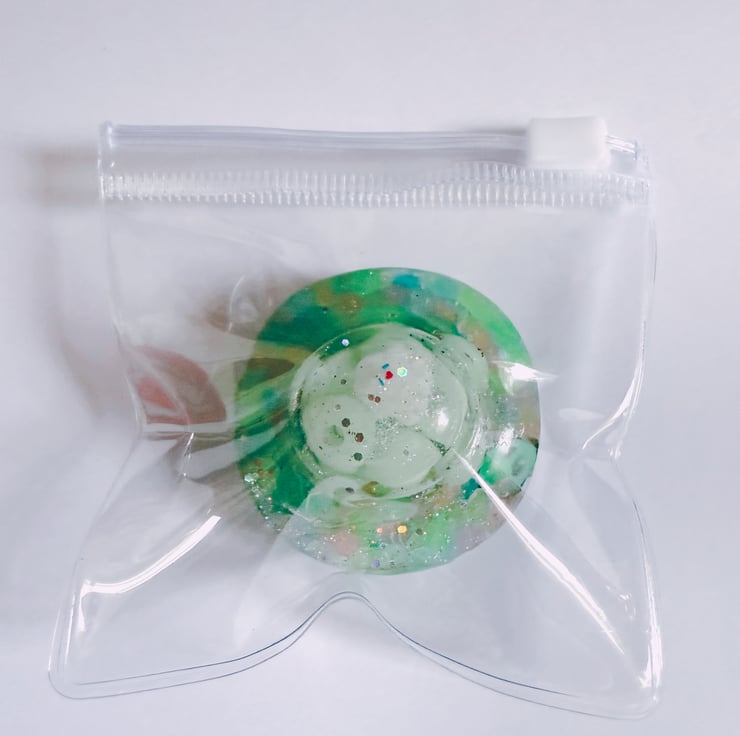 Stop pulling out that beautiful hair and biting those lovely nails! Ground and centre yourself with my textured UFO worry stones! This one glows in the dark too! The bottom is textured with hard, plastic beads that feel rough on the fingers. This one is good for focusing and grounding during panic attacks. Filled with beads, glowing ghosts, glitter beads and one sneaky little alien, this UFO is your new bro! As always stones come in their own pouch with a keychain so you can UFO on the go!