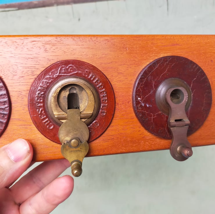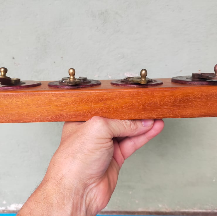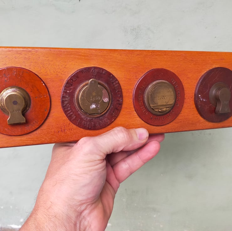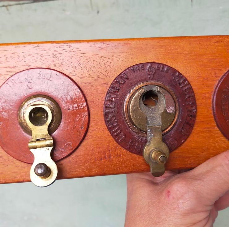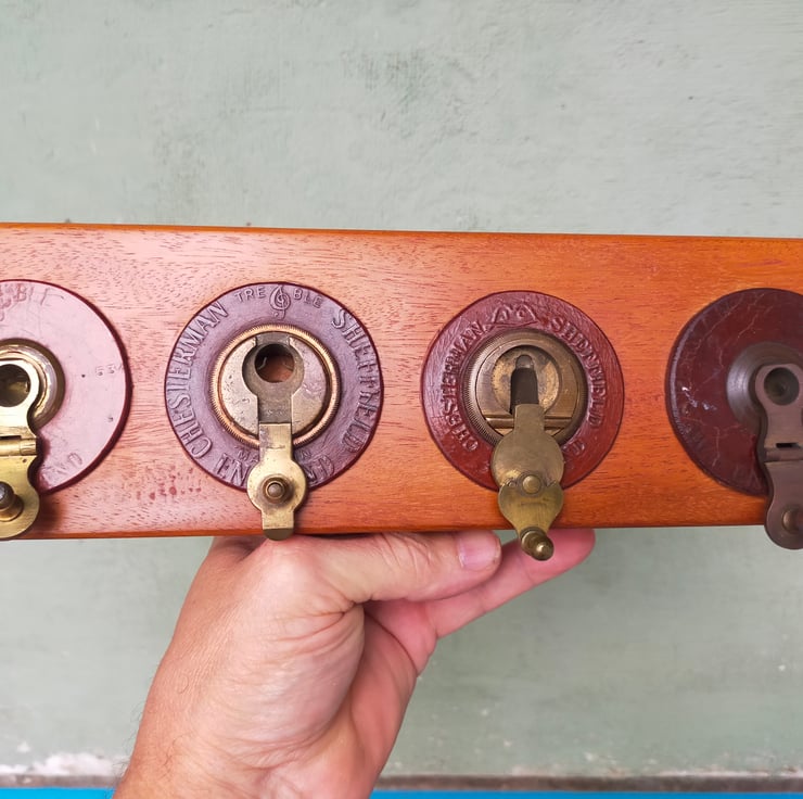 If you are of a certain age, you will remember the big leather tape measures brought out on sports days, with their elaborate brass mechanisms for winding the tape back in. These racks are all crafted from a solid block of reclaimed Brazilian mahogany, into which the winding mechanisms have been embedded, many with their embossed leather surrounds, to create a characterful and distinctive piece of retro home furnishing that will be a talking point for all your guests. Brass on mahogany is a classic look, evocative of our seafaring history; throw in some well worn embossed leather and I think you have a beautiful combination. Add to that the knowledge that these tape measures have had a long life measuring out the long jumps and javelin throws of British youth, and you have a beautiful and evocative addition to your home. Of course the actual tapes themselves don't go to waste, as can be seen from my door screens. I have used mirror slots as a hidden fixing and given them a clear wax finish.