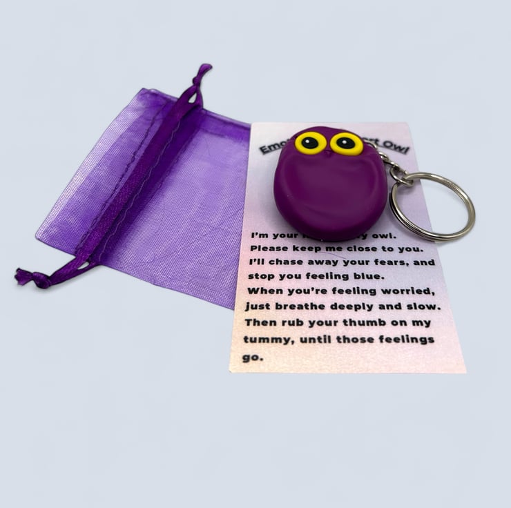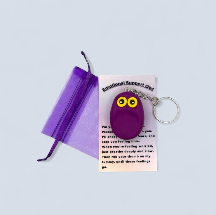 The owl is attached to a card that includes a poem I wrote about its purpose. You can easily detach the owl from the card for convenience, allowing you to attach it to your keys or handbag. Additionally, I’ve included a small organza bag in a complementary colour for safely storing your owl buddy if you prefer. I usually keep mine in the bag in my pocket when not in use, and when I use it, I put the split ring on my finger, which serves as an extra fidget tool while also ensuring I don’t drop my owl.