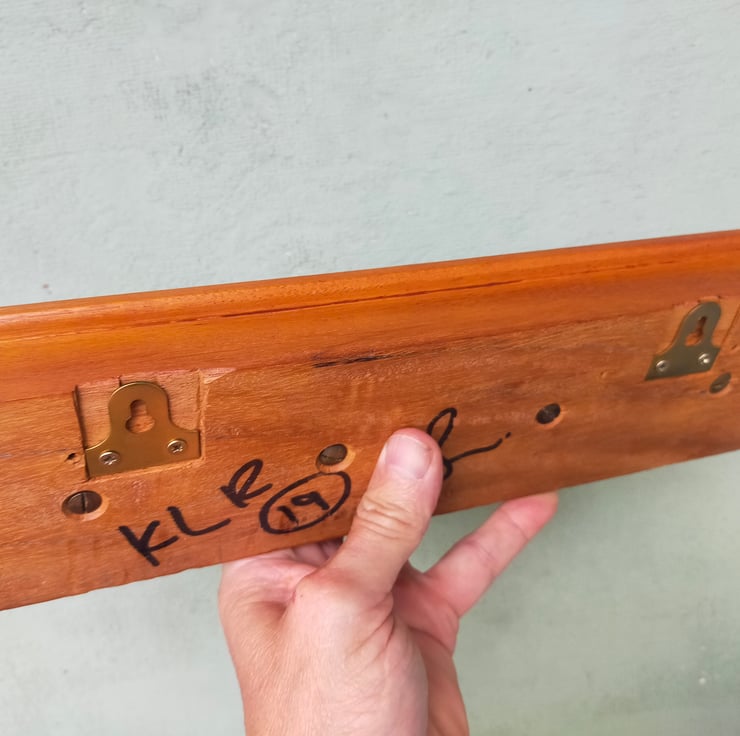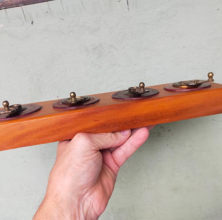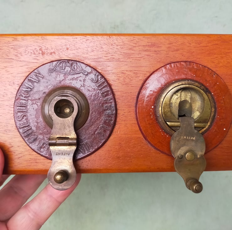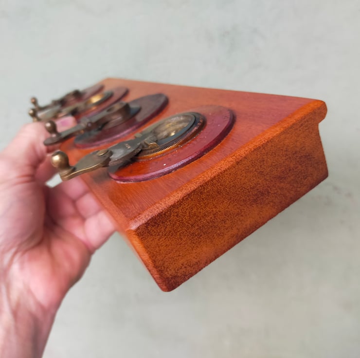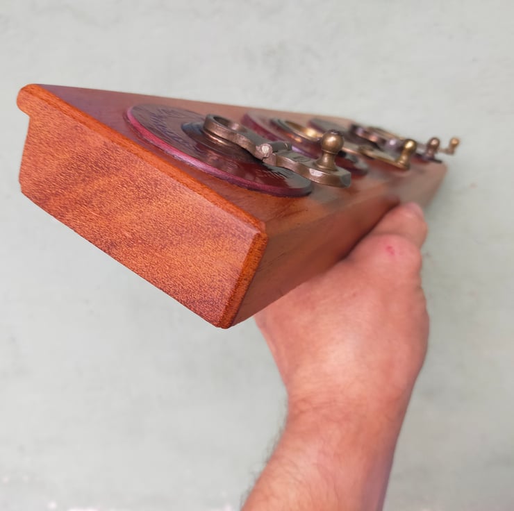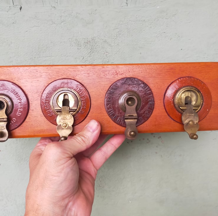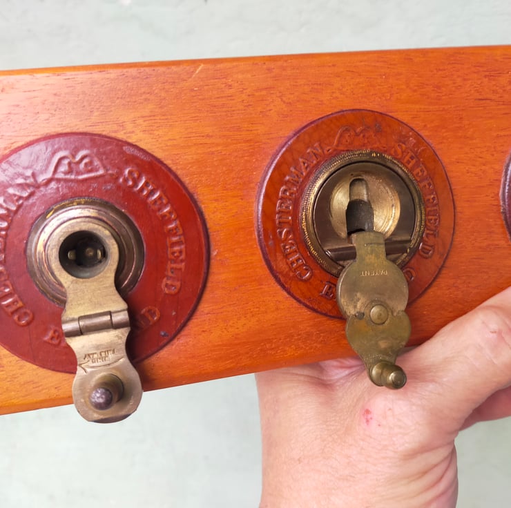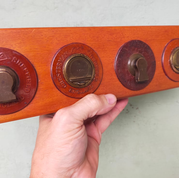 If you are of a certain age, you will remember the big leather tape measures brought out on sports days, with their elaborate brass mechanisms for winding the tape back in. These racks are all crafted from a solid block of reclaimed Brazilian mahogany, into which the winding mechanisms have been embedded, many with their embossed leather surrounds, to create a characterful and distinctive piece of retro home furnishing that will be a talking point for all your guests. Brass on mahogany is a classic look, evocative of our seafaring history; throw in some well worn embossed leather and I think you have a beautiful combination. Add to that the knowledge that these tape measures have had a long life measuring out the long jumps and javelin throws of British youth, and you have a beautiful and evocative addition to your home. Of course the actual tapes themselves don't go to waste, as can be seen from my door screens. I have used mirror slots as a hidden fixing and given them a clear wax finish.