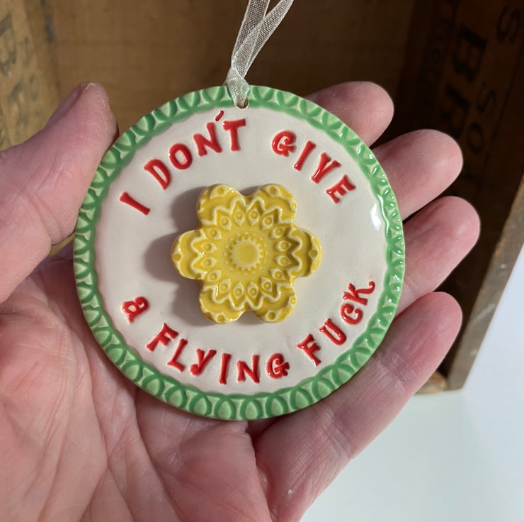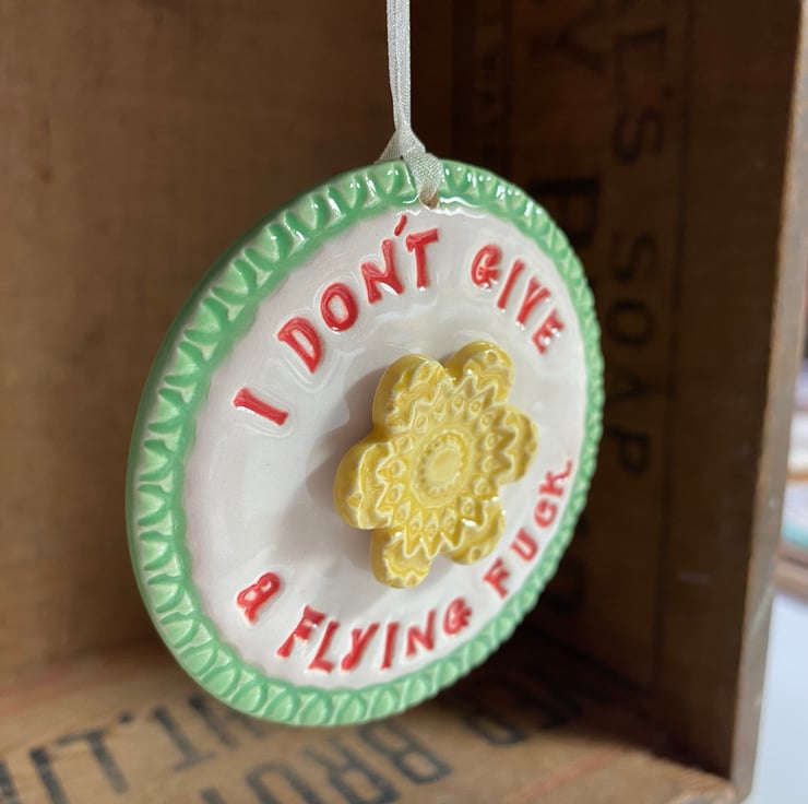This ceramic decoration is made from white earthenware clay and finshed with a little pottery flower. It has swear words on the front - to be clear you will not get a censored version, you will receive the full swear words. It has been fired twice and finished with a glossy glaze for a lovely smooth finish. It measures 6.5cm diameter x 1cm deep and hangs from a green organza ribbon.