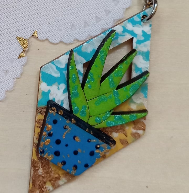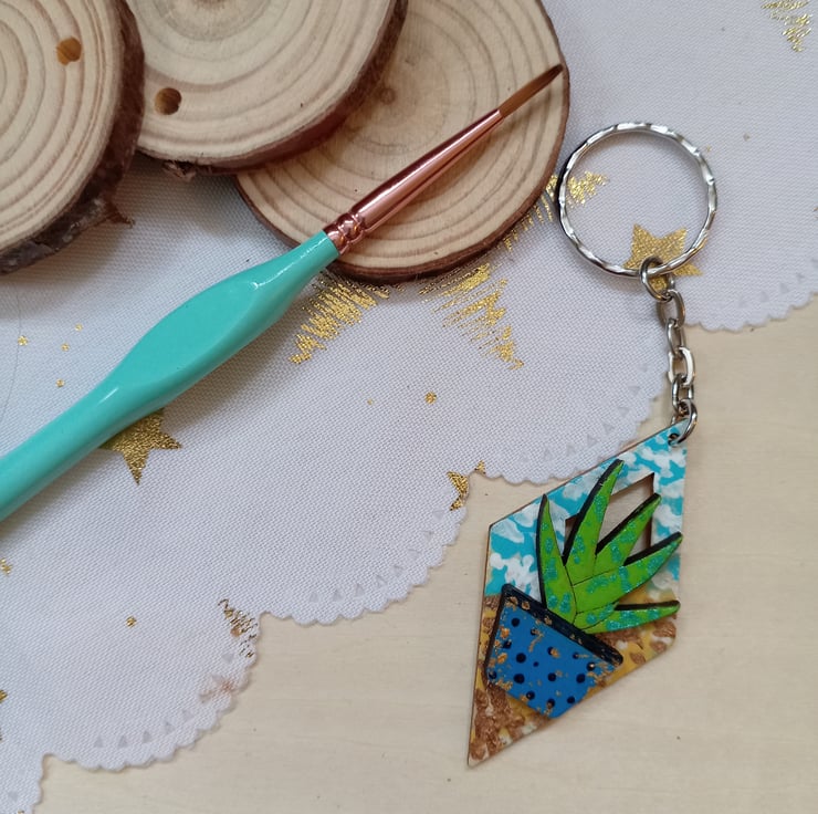 A 7cm x 4cm wooden diamond shaped Keyring featuring a cut out centre and a hand painted beach style background with a raised potted succulent plant detail
