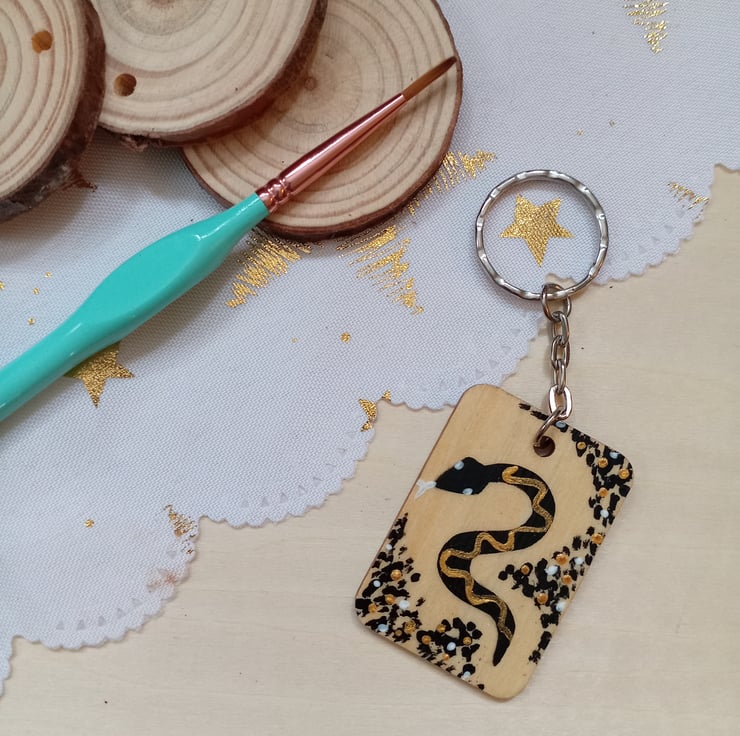 A 3cm x 4cm wooden rectangular keyring hand painted with a simple black and gold snake design and dot work background