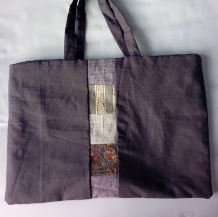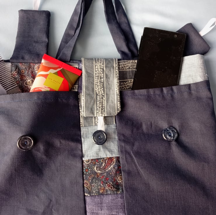 It has an attractive panel of patchwork squares in various denim blue prints across the top and down the centre. The reverse of the bag has a matching panel just down the centre. The bag itself also fastens with a tab and button. The two hand held handles are reinforced with a piece of cord enclosed within the navy blue fabric handles.