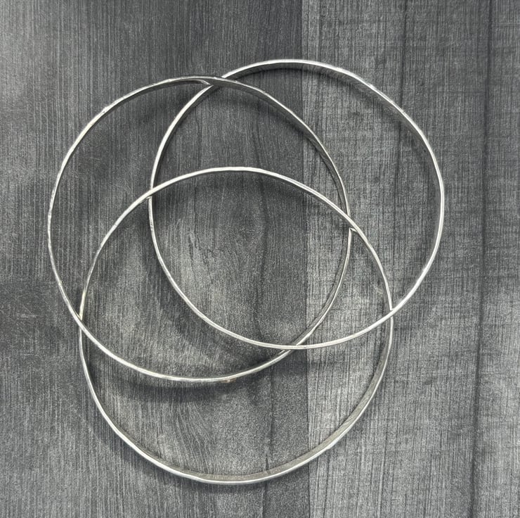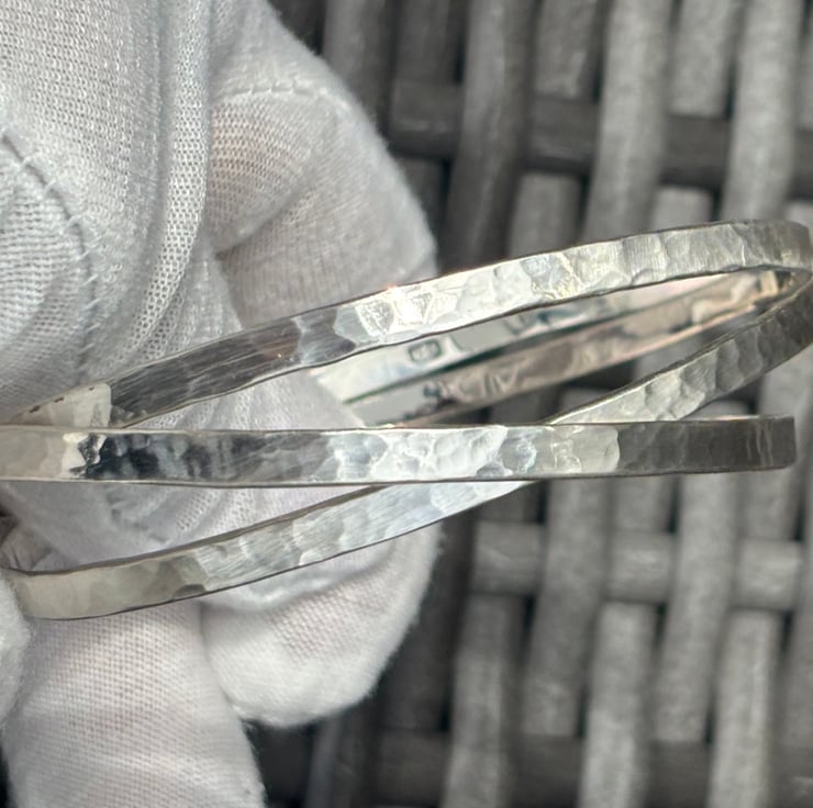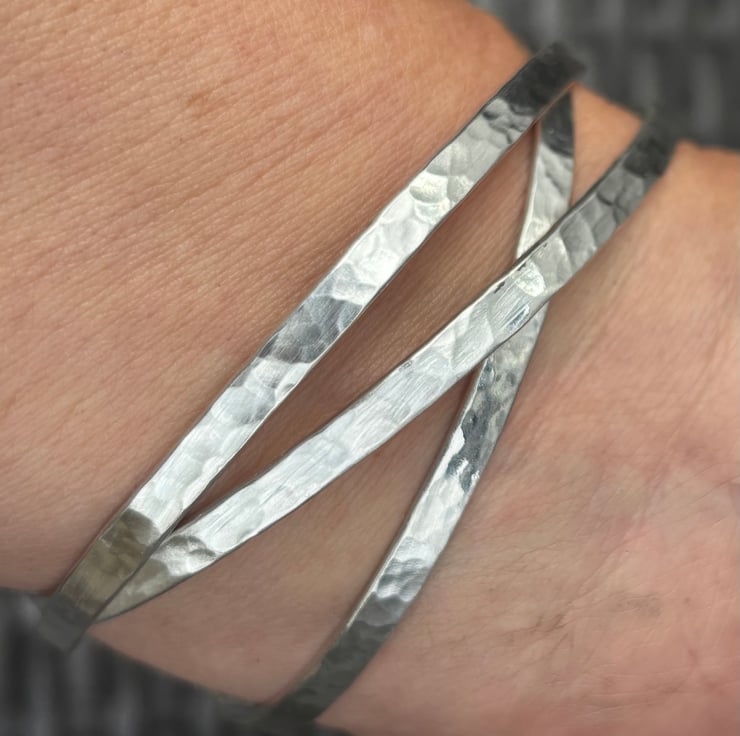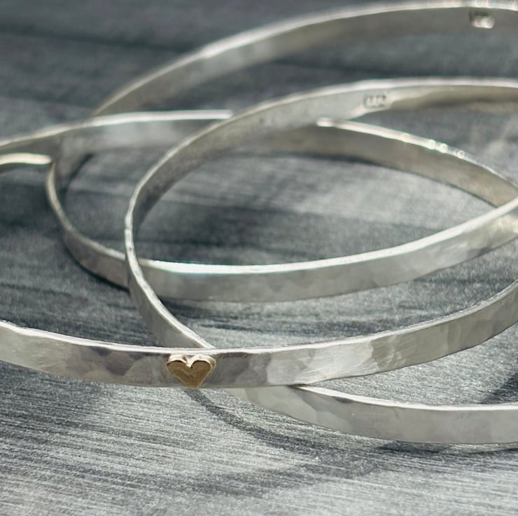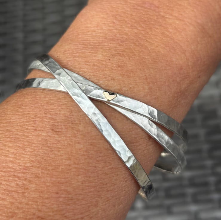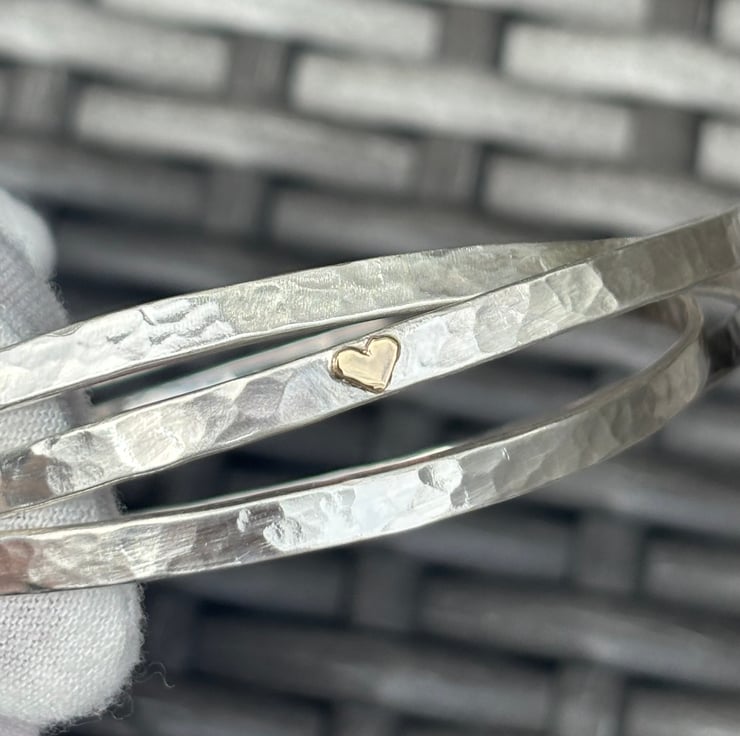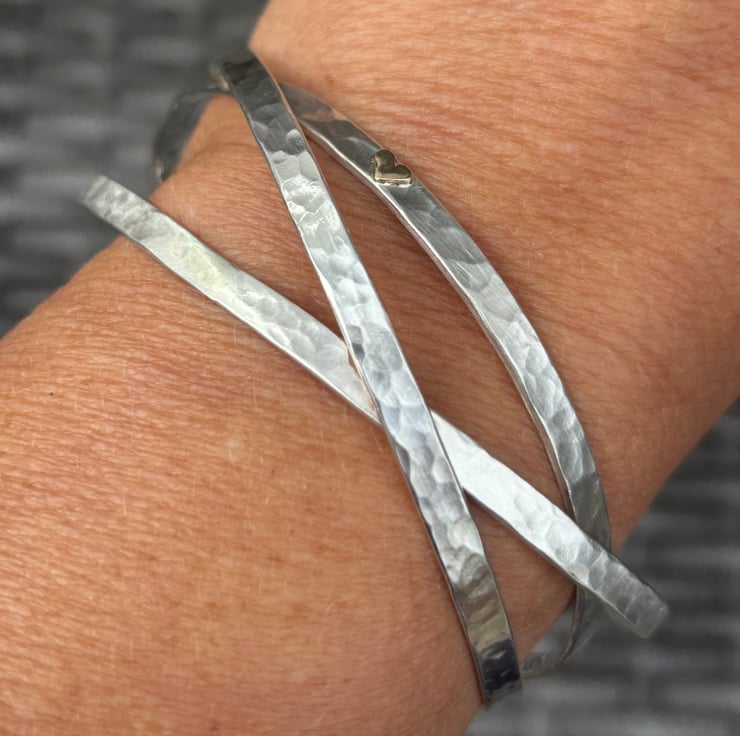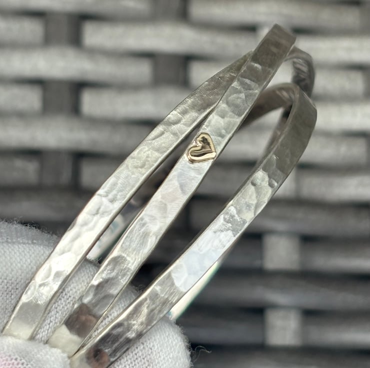 This Russian Bangle has been made from solid Sterling silver and 9ct gold. The bangle is made up of three, hammered interlocking bangles. The middle bangle features a shiny 9ct yellow gold heart which contrasts beautifully with the satin finished silver. Each bangle measures approximately 4mm wide and fits a medium sized wrist. If you need a different size please message Michelle.