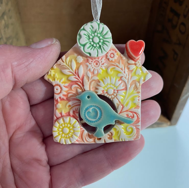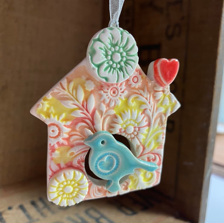 This little bird house decoration is made from white earthenware clay and finshed with a little pottery bird. It has been fired twice and finished with a glossy glaze for a lovely smooth finish. It measures 7.5 x 7cm and hangs from rustic brown string