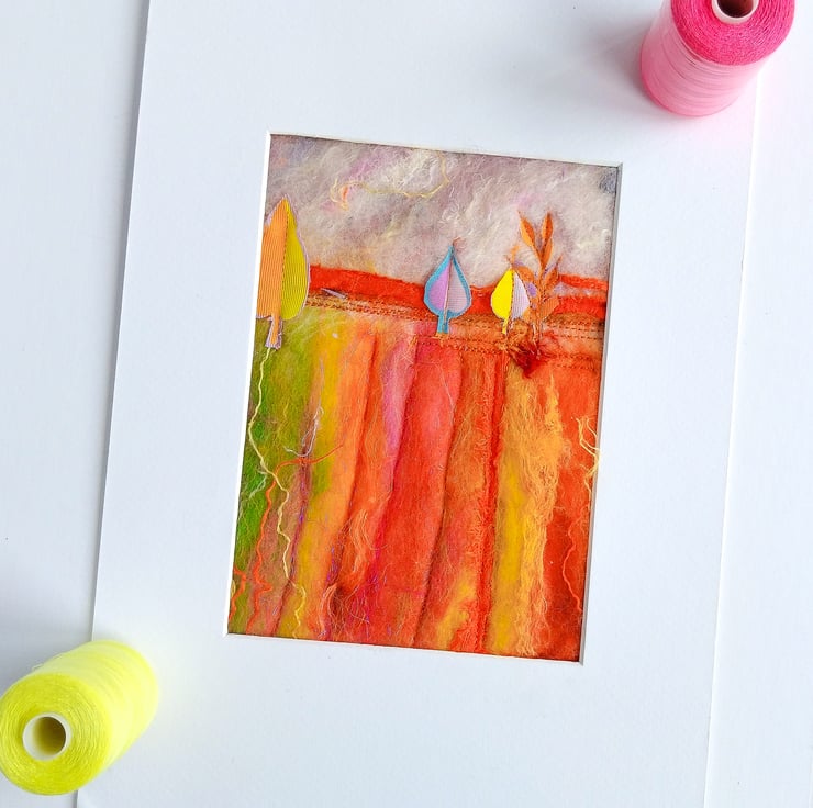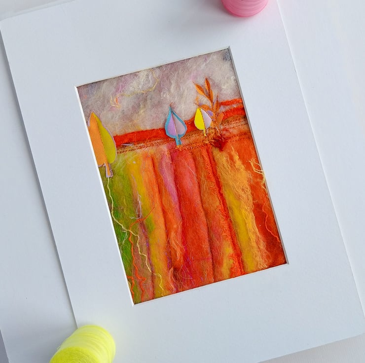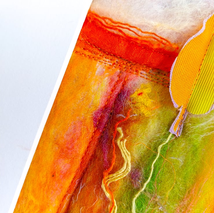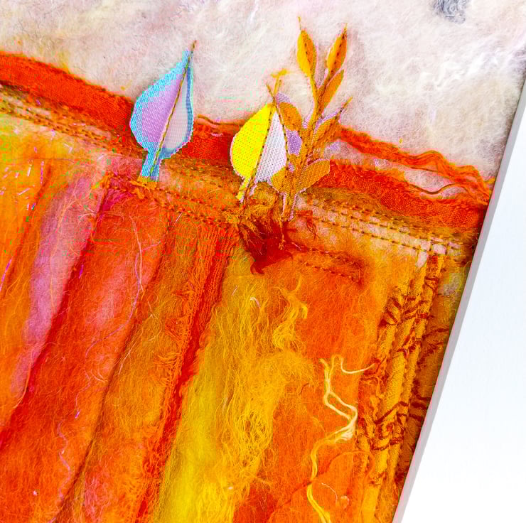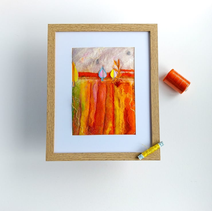 Created from wispy threads, wools and fine fabrics and silks. Finished with appliqué and free motion stitch.