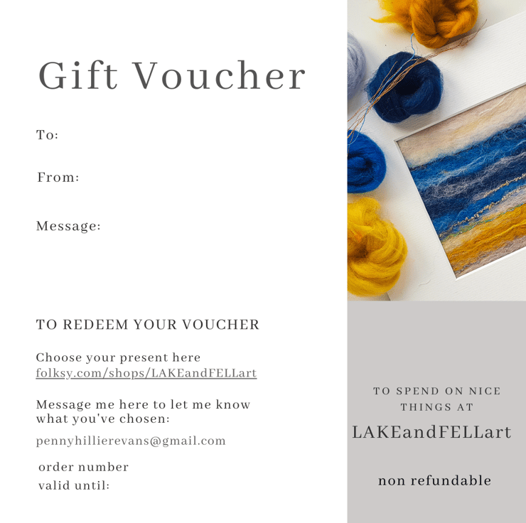 Looking for an original gift, what about a gift voucher. These can be used here in my Folksy shop for craft kits and original art.