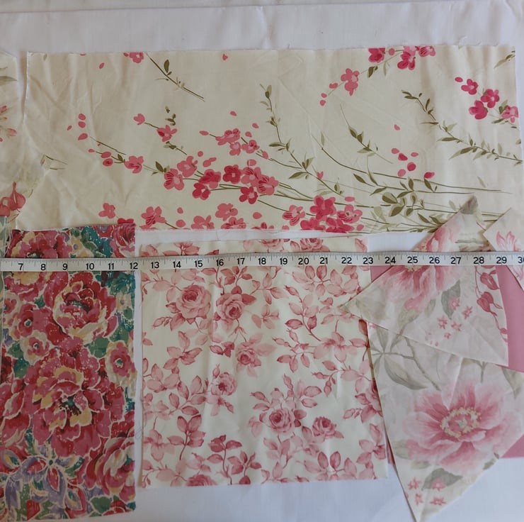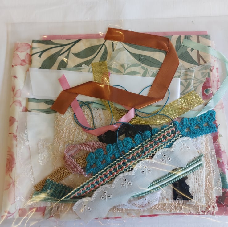 Mixture of fabrics, lace, ribbons, label, wooden heart, stamped calico pieces, trims, gems,