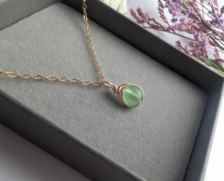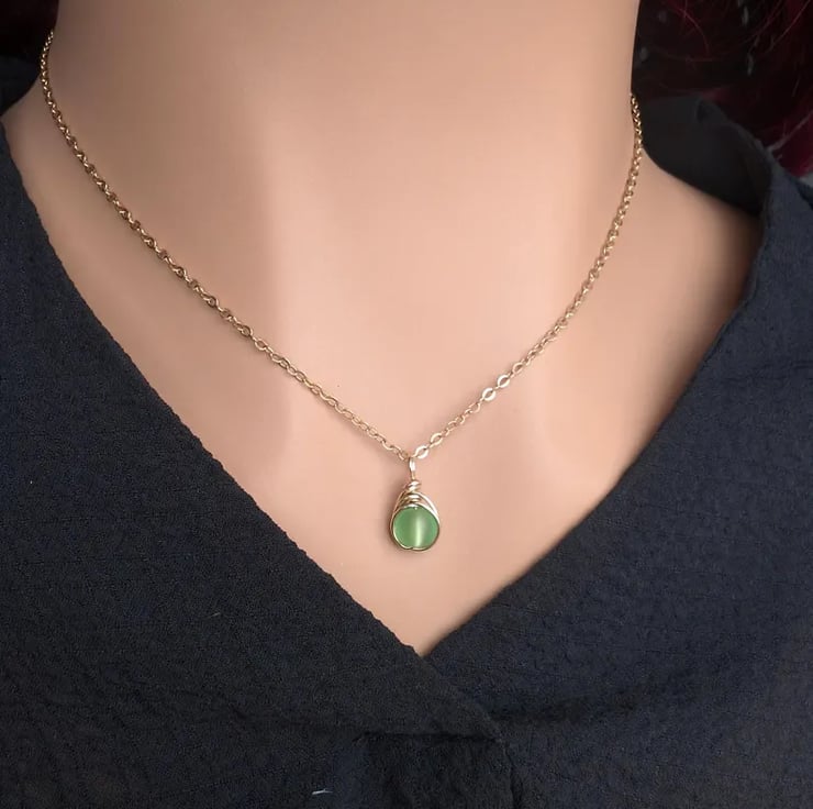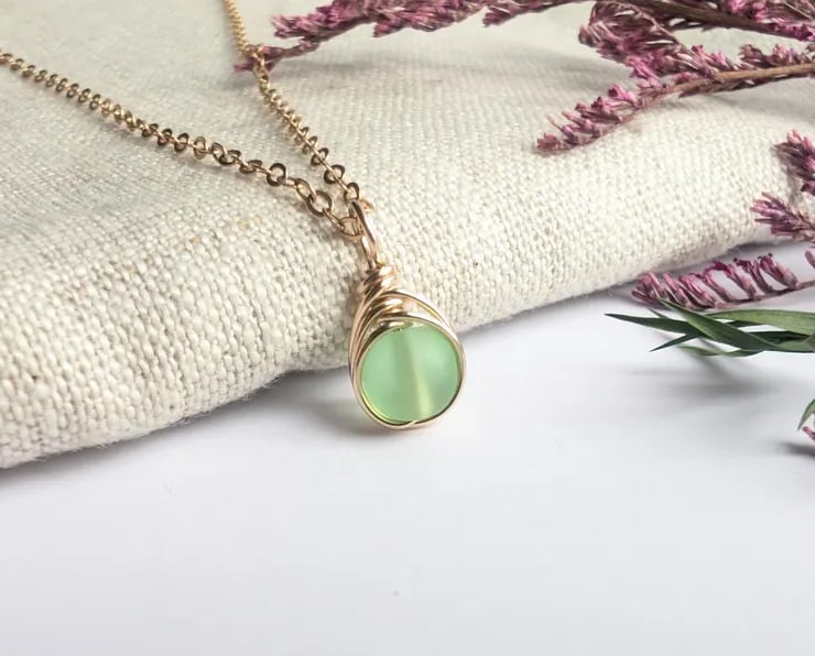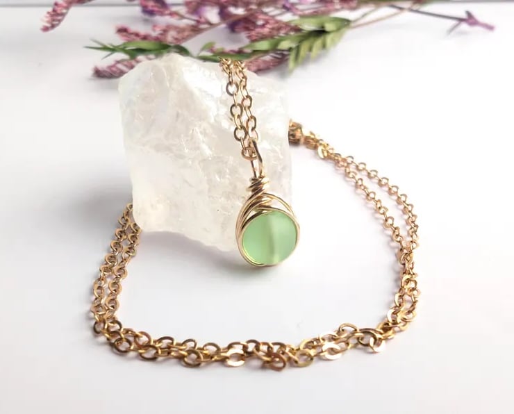 Delicate handmade 14K Gold Filled necklace featuring a sea green seaglass bead. Designed with a minimalist touch, and perfect for layering. A simple lightweight necklace that is perfect for everyday wear. This dainty necklace would make a lovely gift for yourself or a loved one.