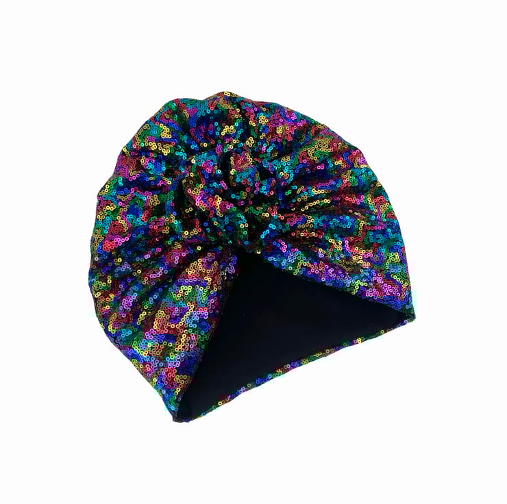 The top layer fabric of the turban head wrap is covered in beautiful, sparkling sequins that catch the light and add a touch of glamour to any outfit. The turban design ensures a comfortable and secure fit that won't slip or slide. It is lined with black cotton jersey.