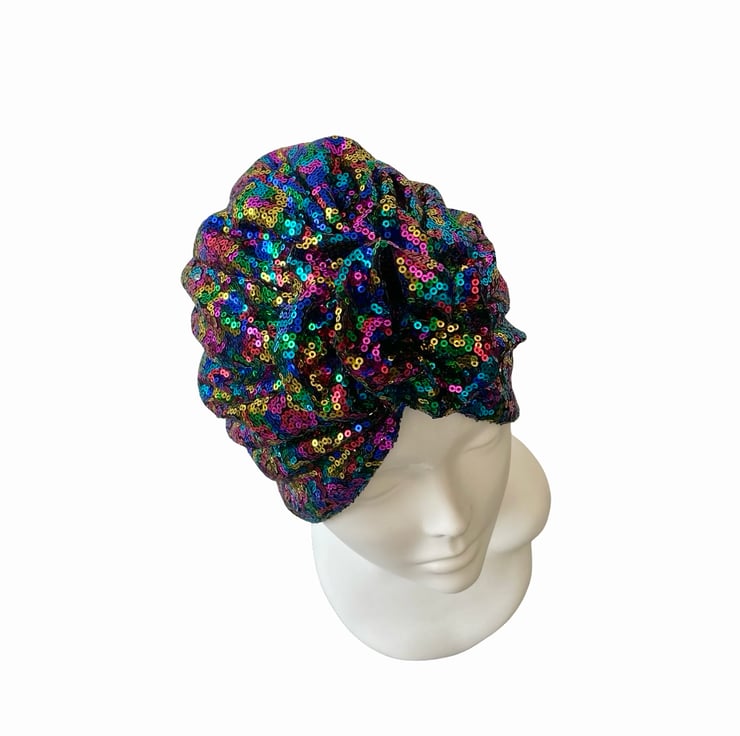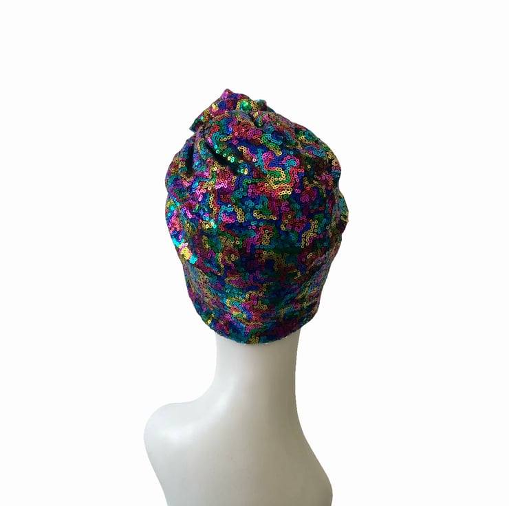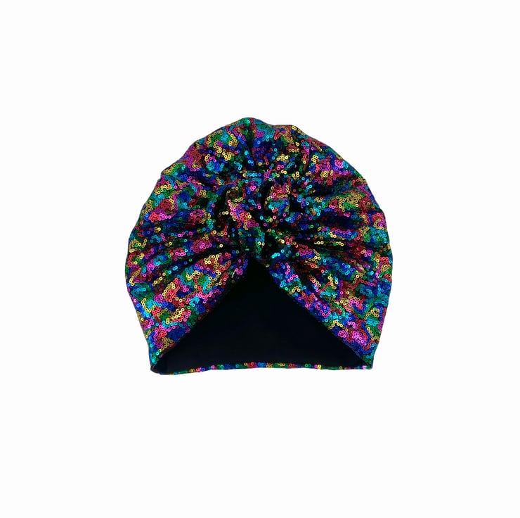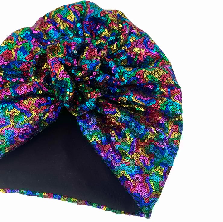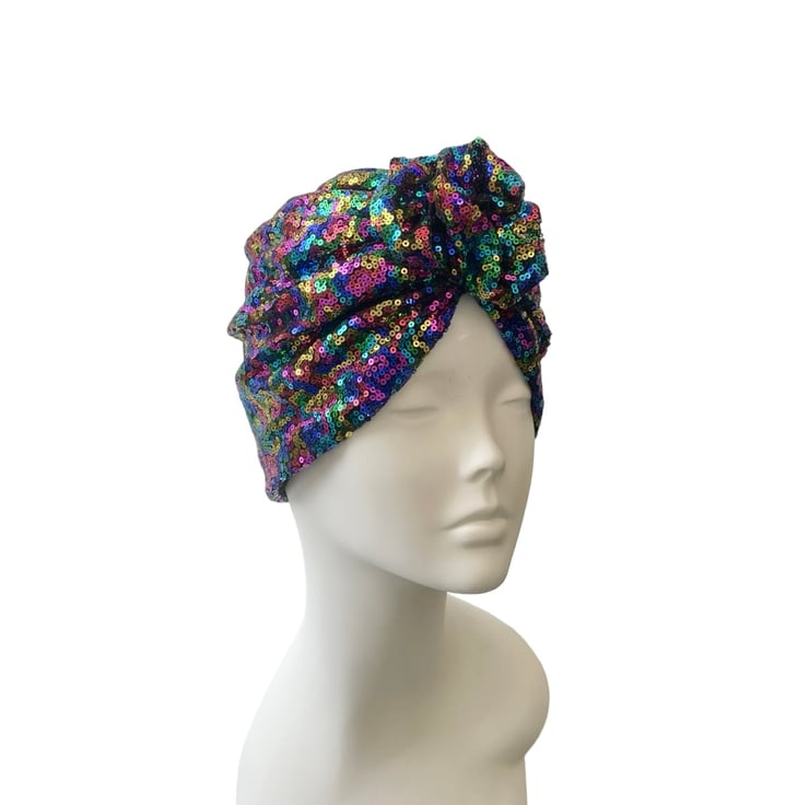 Introducing our colourful and sparkly rainbow sequin turban head wrap hat, the perfect accessory to add some glamour and sophistication to your look. Made with high-quality, stretchy fabric that is comfortable to wear, this turban head wrap is designed to provide full coverage to your head while also adding a touch of sparkle to your outfit.