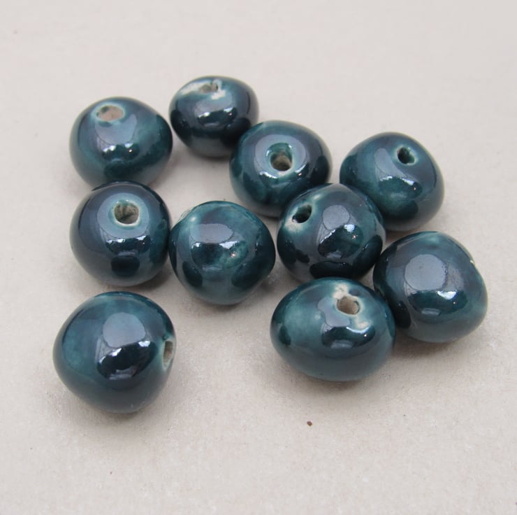 A mixture of handrolled ceramic beads, finished with a translucent petrol blue glaze.