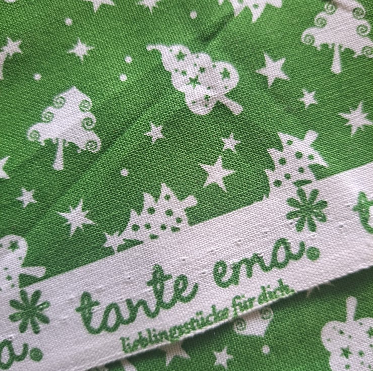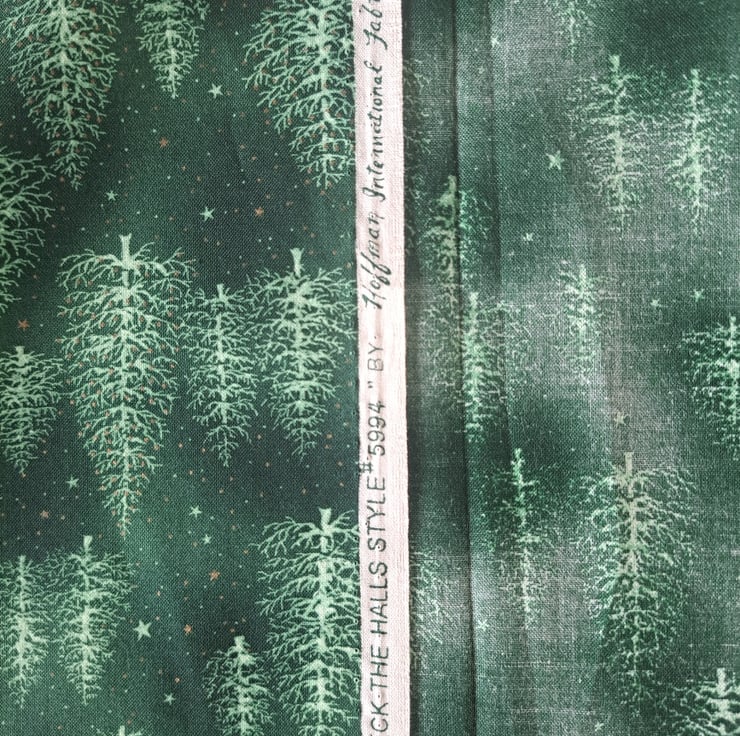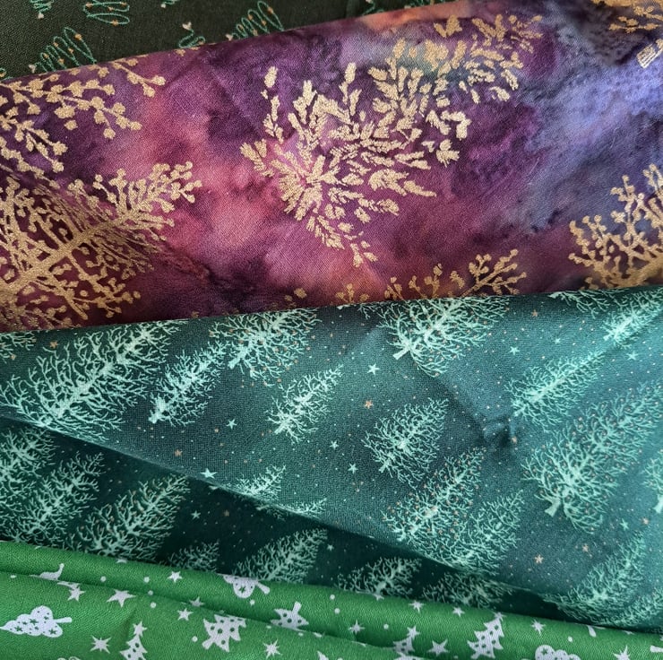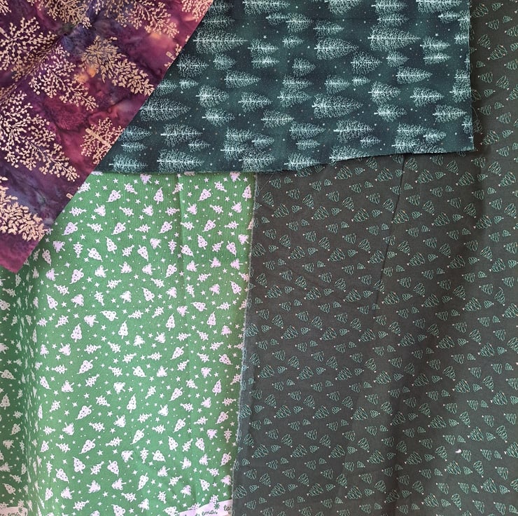 A substantial bundle of four tasteful - yes tasteful - Christmas fabrics, depicting festive fir trees. These are not small scraps by any means: there's a lovely bright green German fabric which measures 81cm across the selvedge and then 105cm in width, with the other two greens of similar sizes. The smallest one is a gorgeous purple and gold fat quarter. Big, big pieces and big on taste. Happy Christmas.