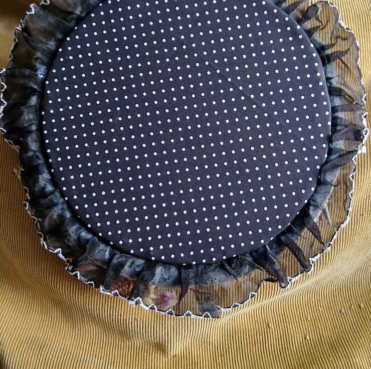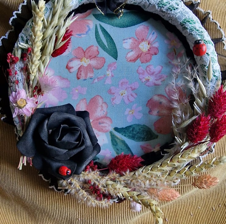 Handmade by me with fabric, wood, lace and real dried flowers. Main hoop is 7 inch in diameter and the centre section is magnetic so can be used to put magnetic items like fridge magnet or magnetic words like bathroom and hung on the bathroom door.