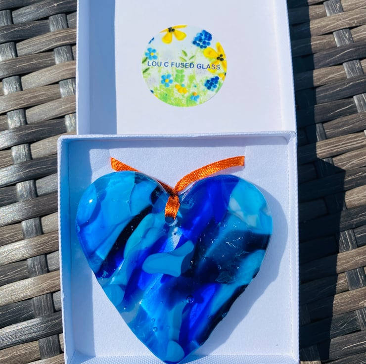 Gorgeous shades of blue in this lovely hanging fused glass heart. The heart ids created over two kiln firings and uses recycled art class . Fired to around 820 degrees to get a smooth surface the heart is then drilled and strung with satin ribbon . The heart is presented in a white gift box . Each heart is totally unique. Drilled and strung with orange satin ribbon . Size approximately 4 inch diameter .
