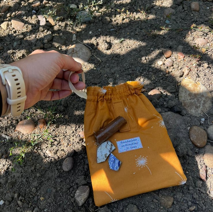 I have a friend who is a mudlarker (she even has a licence for the Thames), and talking to her always makes me pay a little more attention to the floor! There is so much discarded pottery in our fields and on our beaches - not to mention pretty stones and sea glass. I was filling my jeans pockets with bits of pottery and thought, there must be a better way! One picture show's that friend with her bag out in the wild. (Always check for local permissions before removing anything).