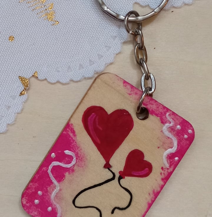 A 3cm x 4cm wooden rectangular keyring with a hand painted heart shaped balloon design featuring two red heart balloons and white swirls