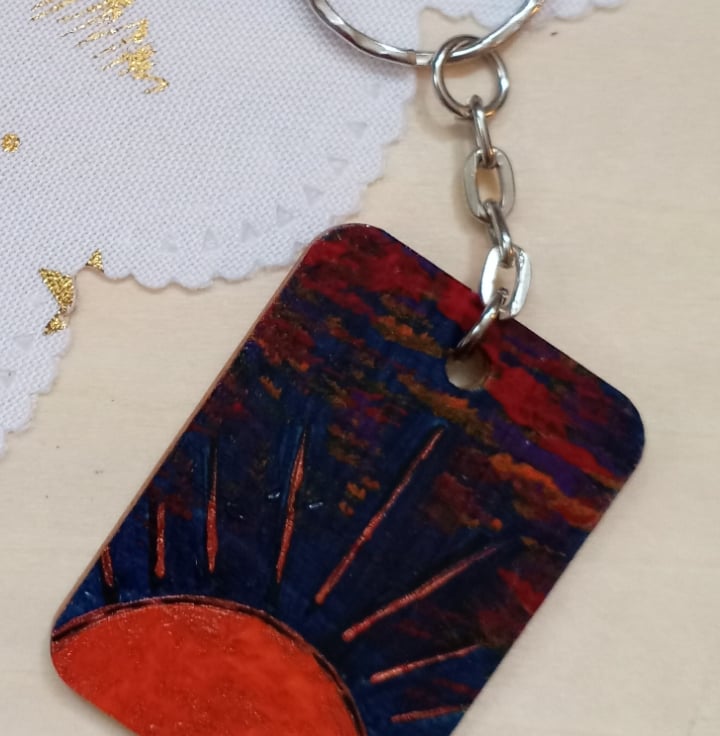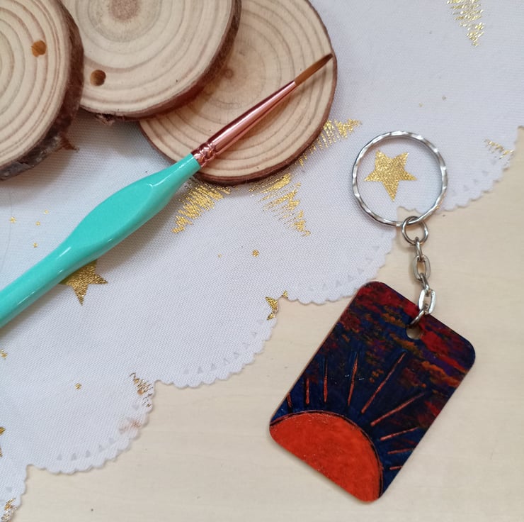 A 3cm x 4cm wooden rectangular keyring with a hand painted sunset design featuring an orange sun and deep blue sky with orange and red