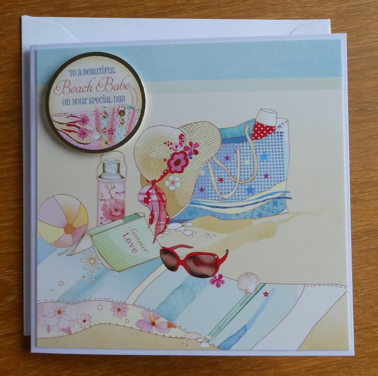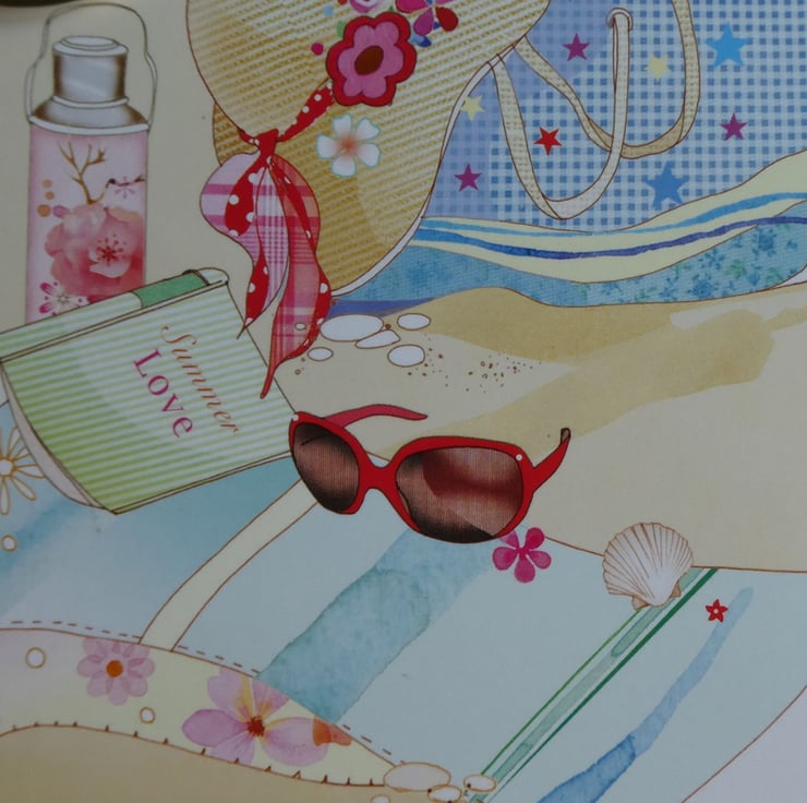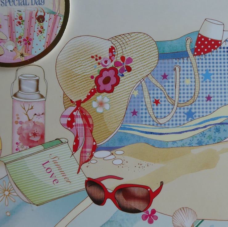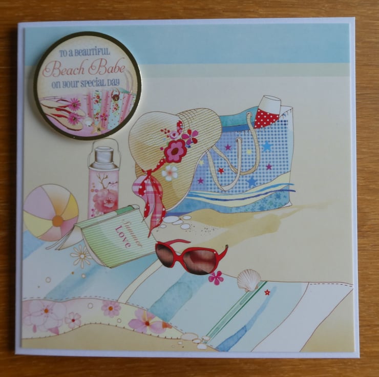 This summery beach themed card has images of a beach towel, sun hat and a beach bag full of supplies.Ideal to send to someone with a summer birthday or who enjoys life at the beach.
