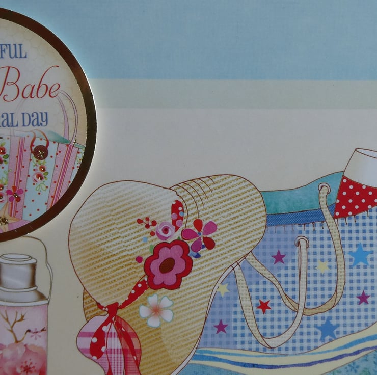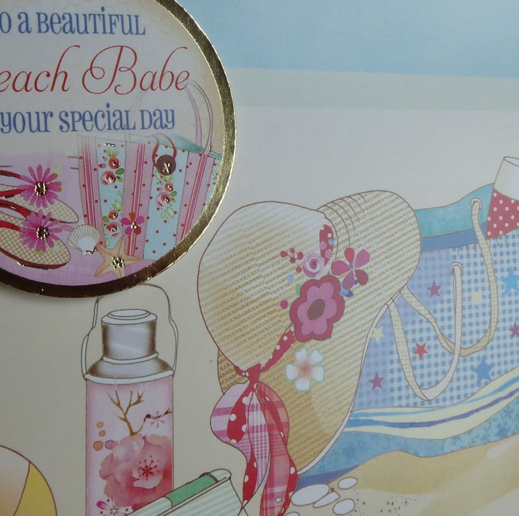 A circular message with an image of a beach bag and a pair of flip flops has the message 'To a beautiful Beach Babe on your special day. The message has been slightly raised on foam pads.