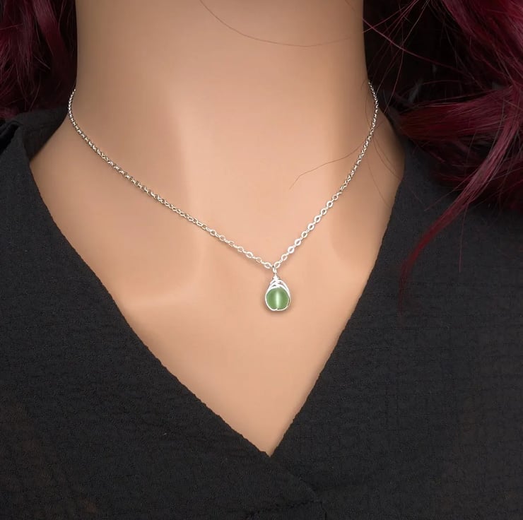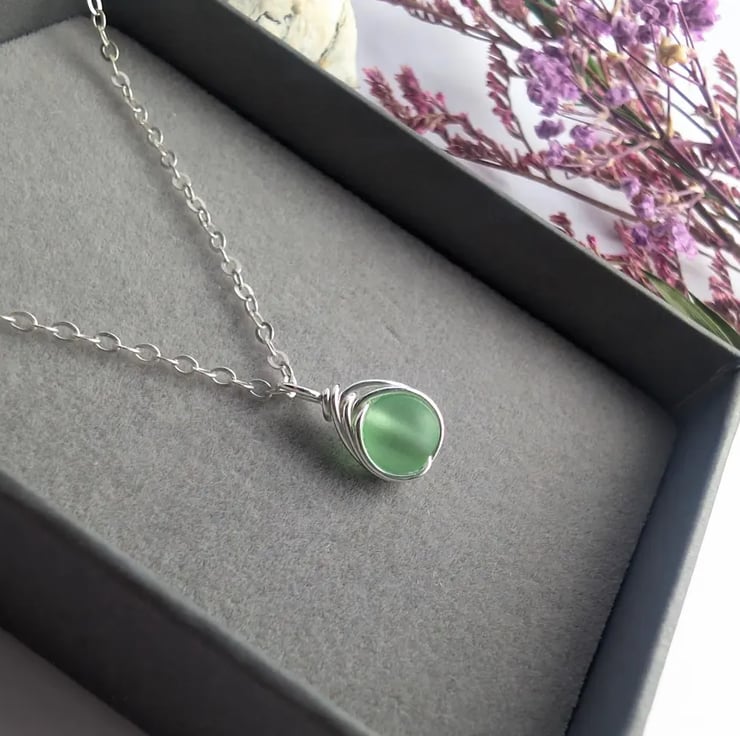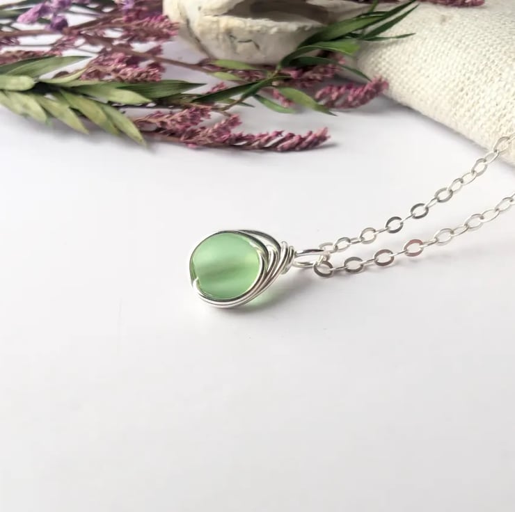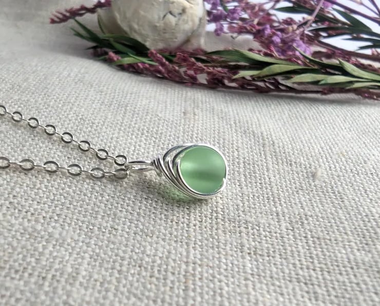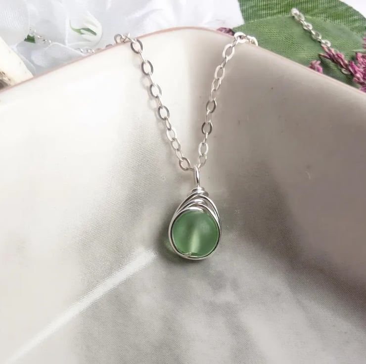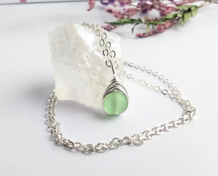 SEAGLASS Spring Green Necklace, Minimalist Dainty Sterling Silver Pendant