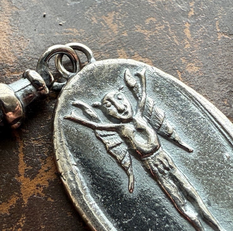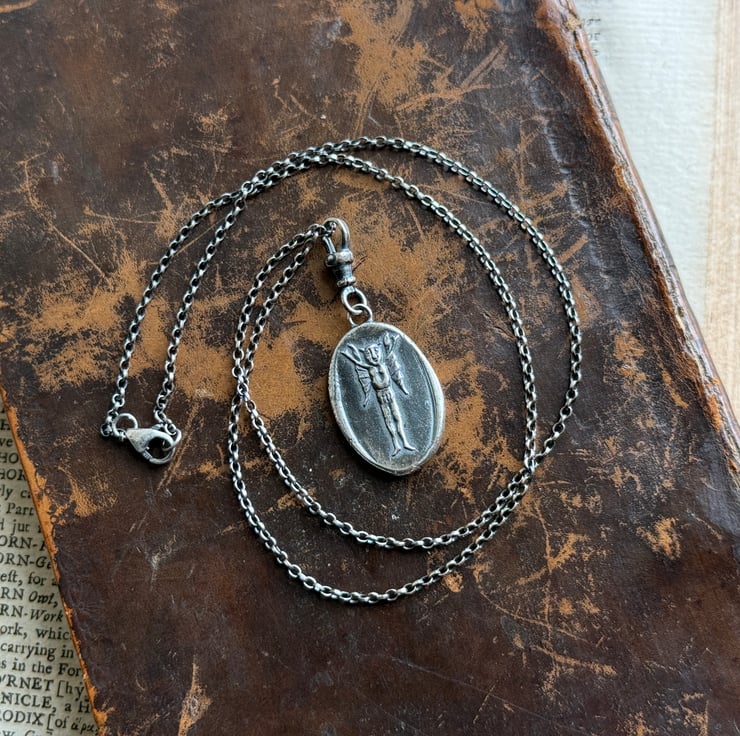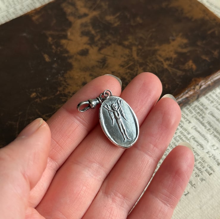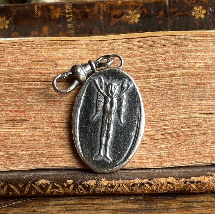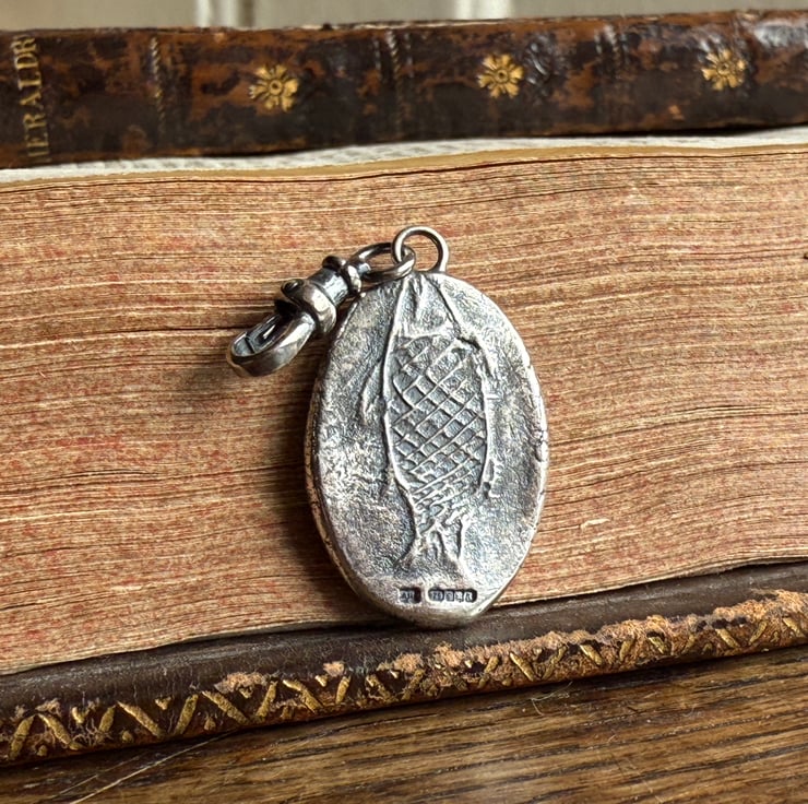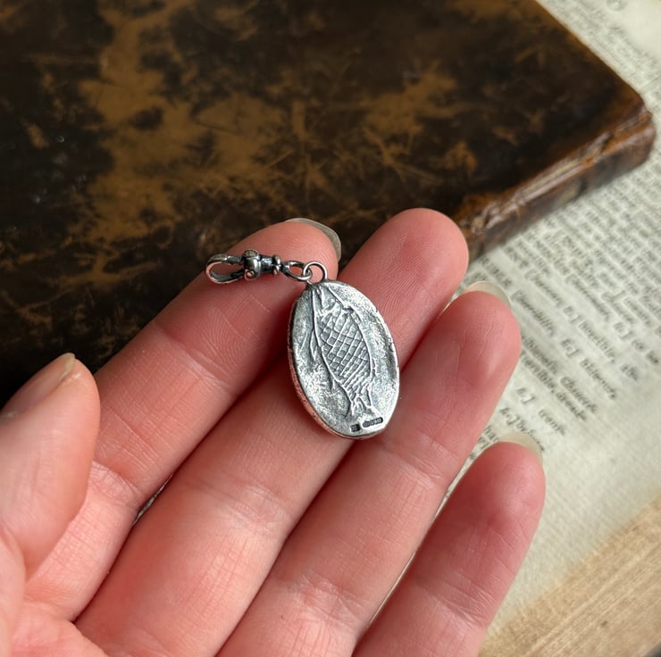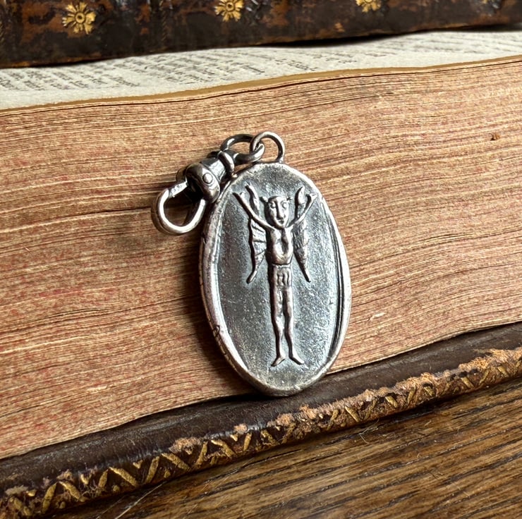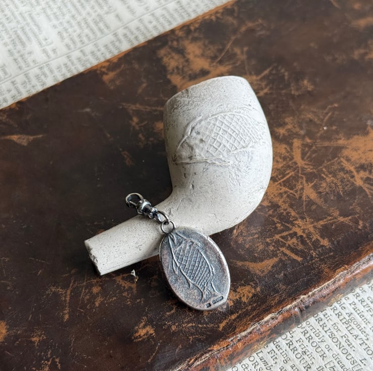 A double sided clip-on wax seal pendant/charm. Made from the impressions of an antique seal from Alex's beloved collection, featuring a cheeky Imp/fairy, a common feature in British and Irish folklore and the impression of an antique clay smoking pipe fish on the reverse. It is made in recycled sterling silver.