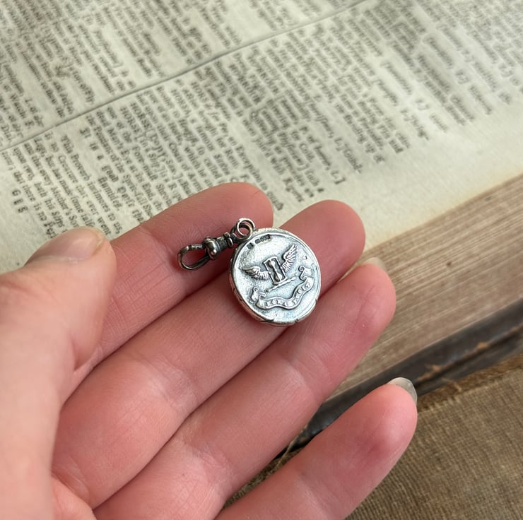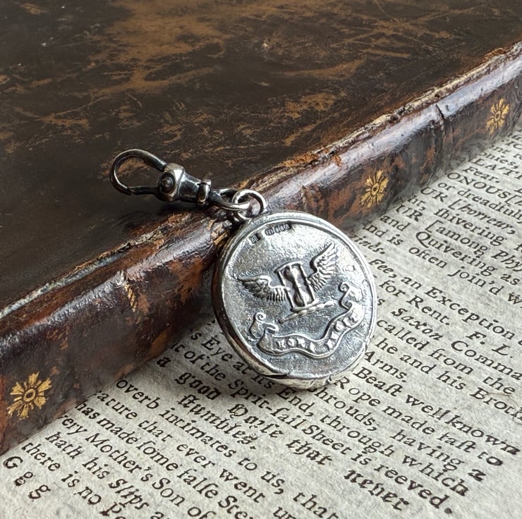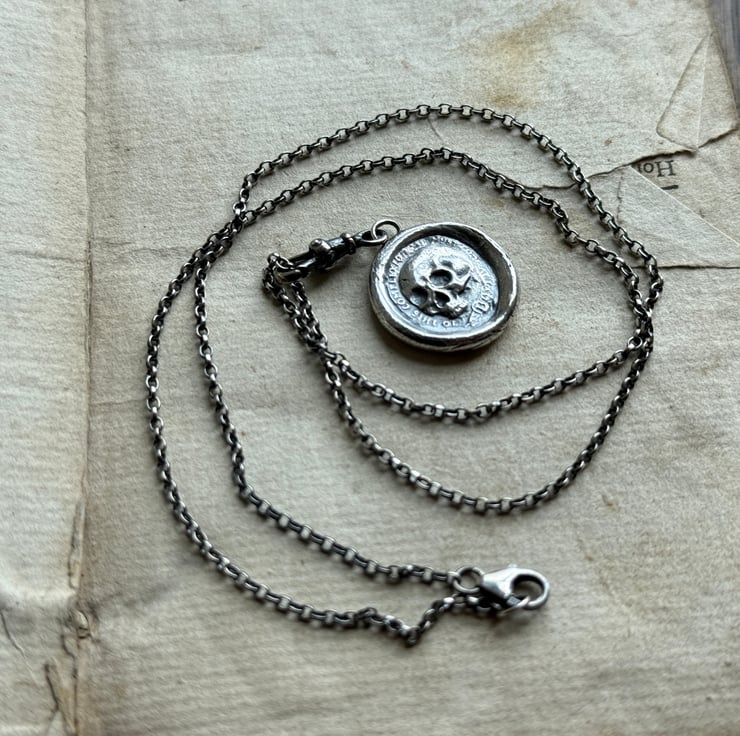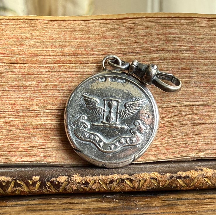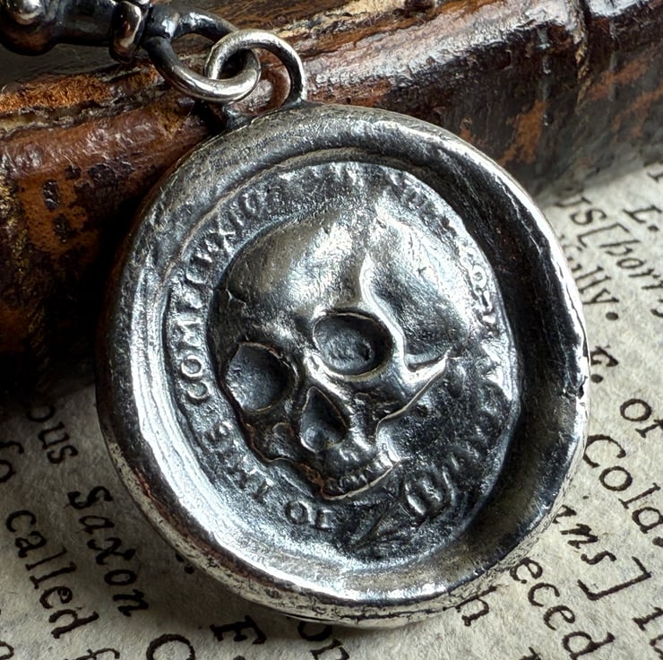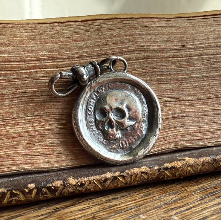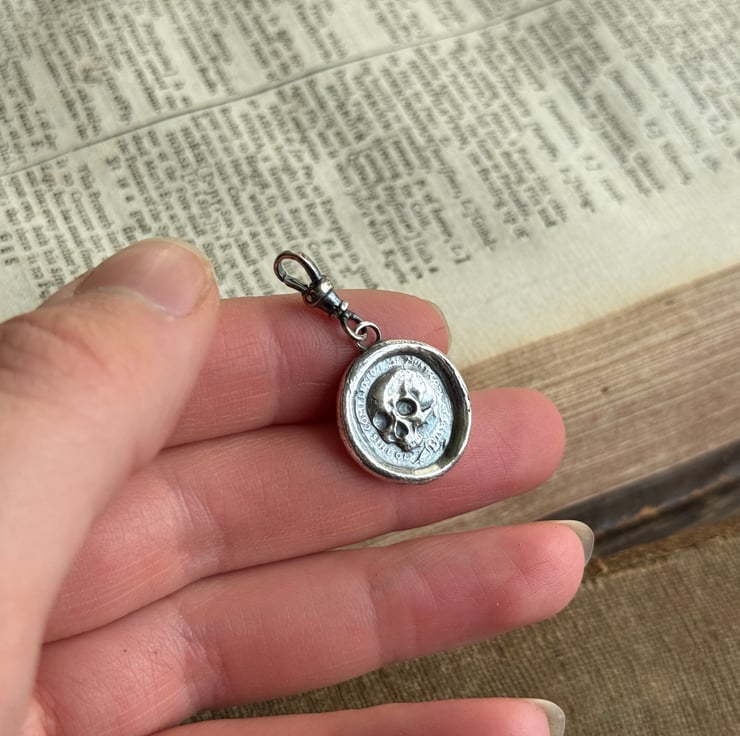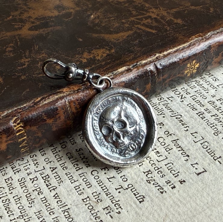 A double sided clip-on wax seal pendant/charm. Made from the impressions of two 17th & 19th century seals from Alex's beloved collection, the oldest featuring a human skull and the English motto "TO THIS COMPLETION WE MUST COME AT LAST". On the reverse is a classic winged hourglass motif with the latin motto "HORA FUGIT" (time flies.) It is made in recycled sterling silver.