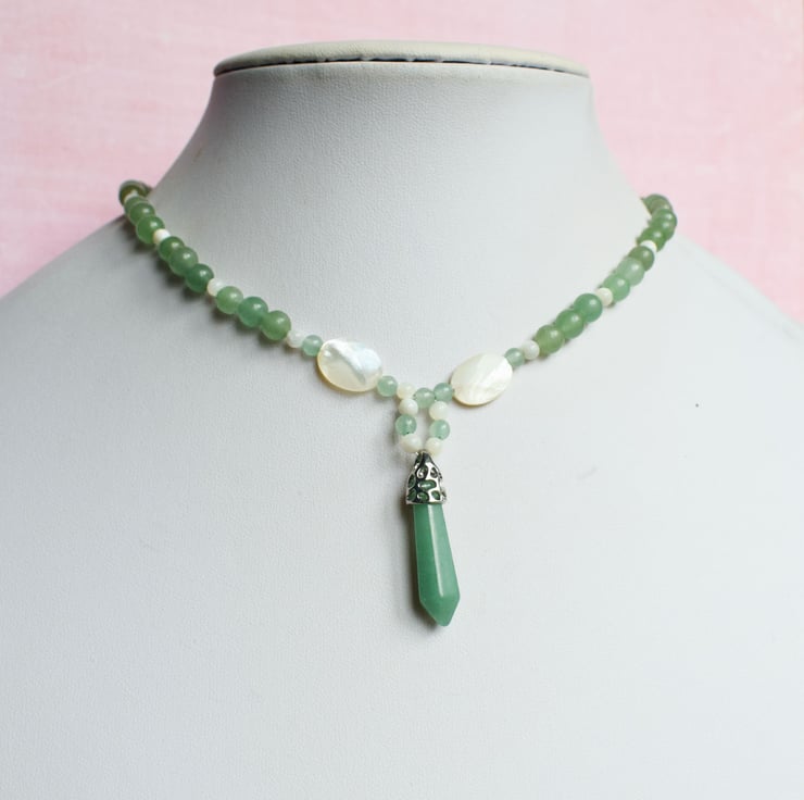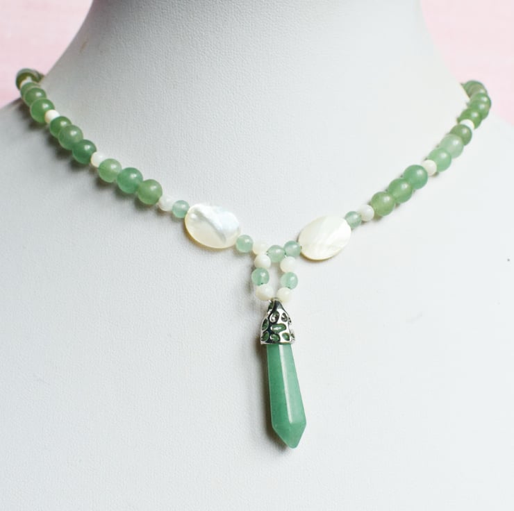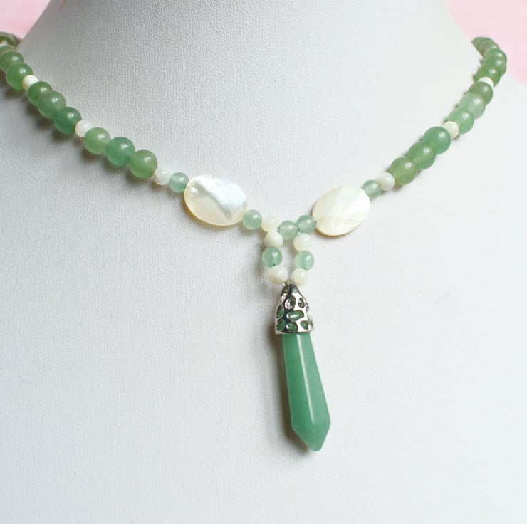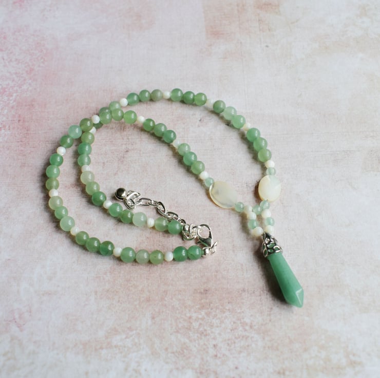 I have made this with an aventurine pendant hung from a necklace made with green aventurine beads contrasting with tiny mother of pearl beads. Just either side of the centre is a larger faceted mother of pearl bead that catches the light beautifully. It fastens with a lobster claw clasp and is approx 18.5 inches long with an extender chain allowing it to be worn up to 21 inches.