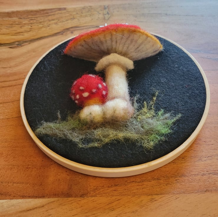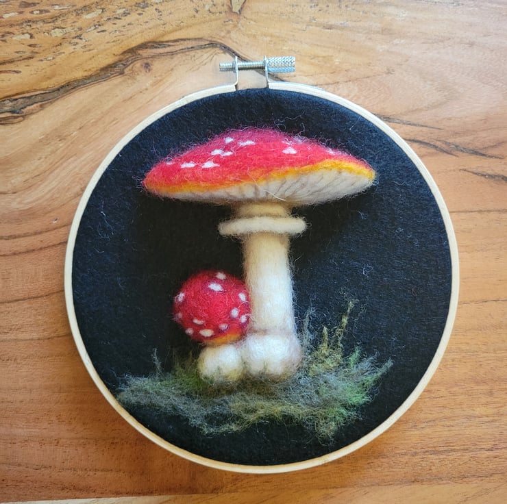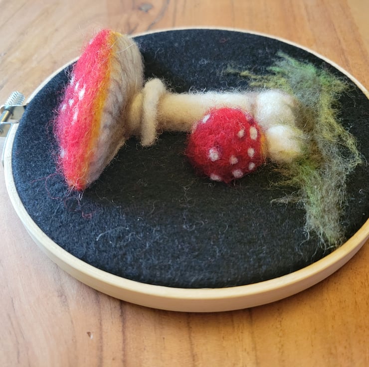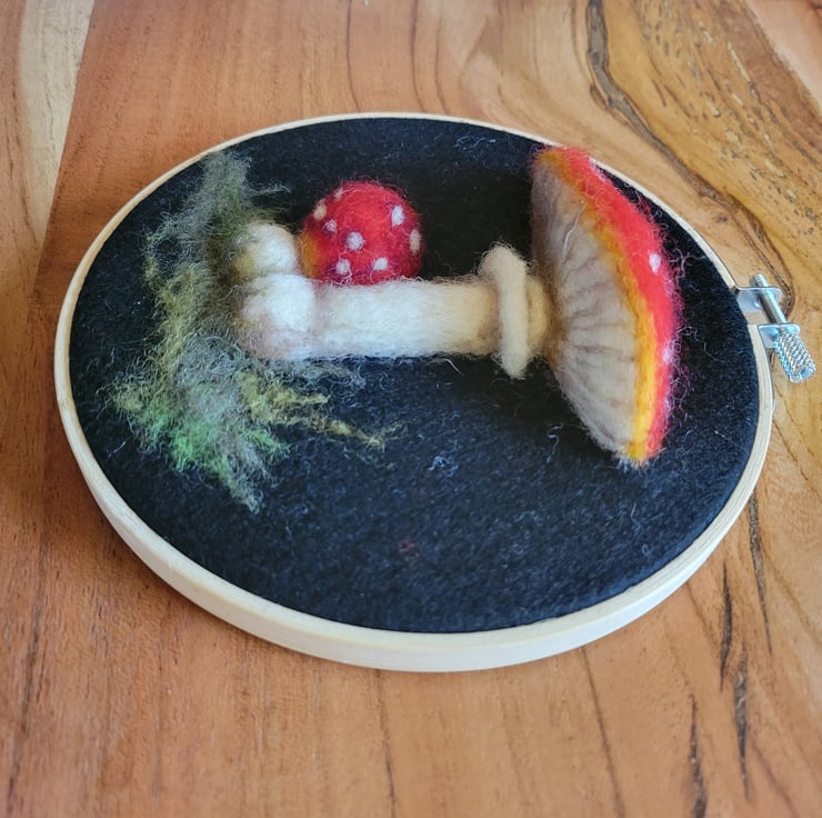 A needle felted wool 3d fly agaric picture on black felt in a wooden embroidery hoop