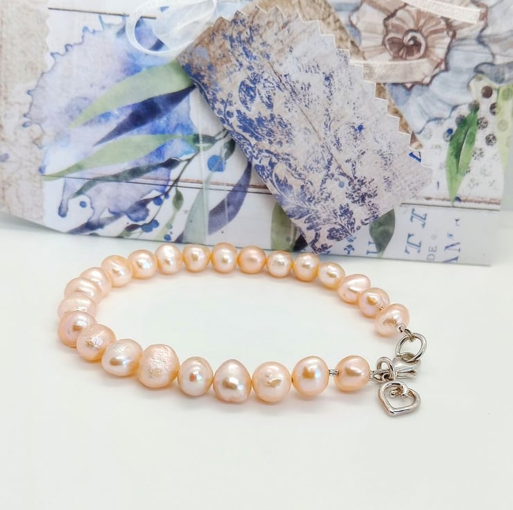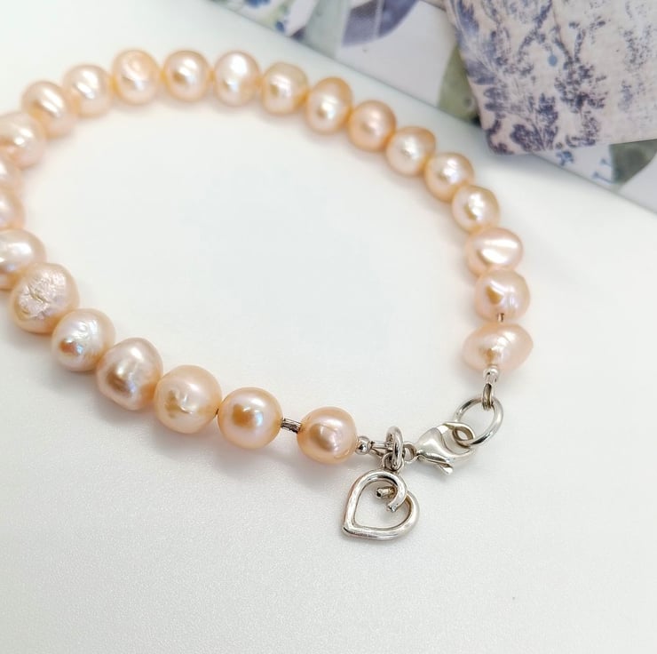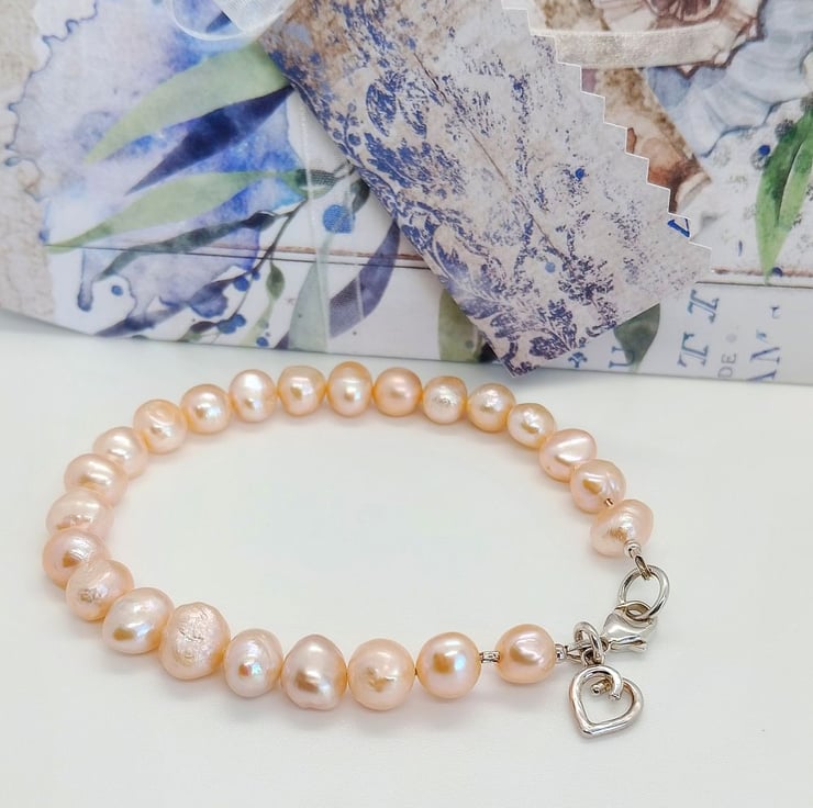 Natural peach colour freshwater pearl bracelet finished with a small sterling silver heart charm and lobster claw fastenings make it an easy piece to add to your wardrobe whatever the season.