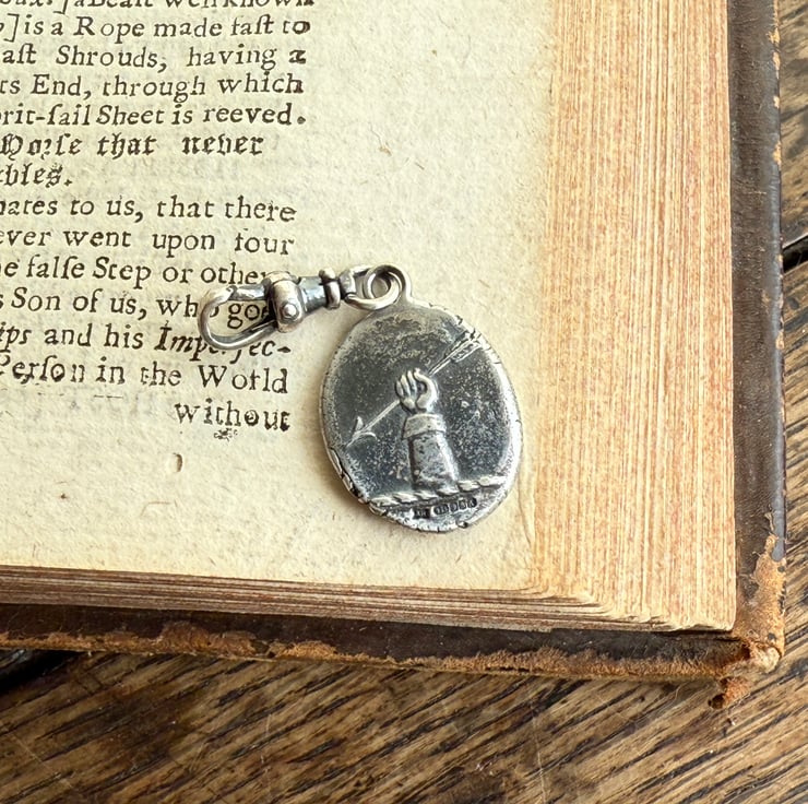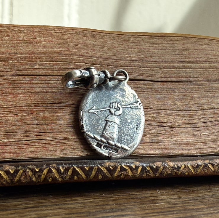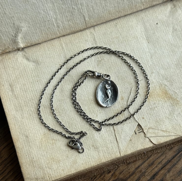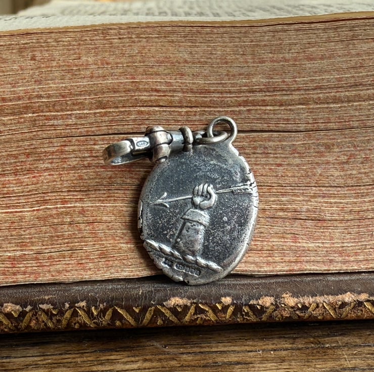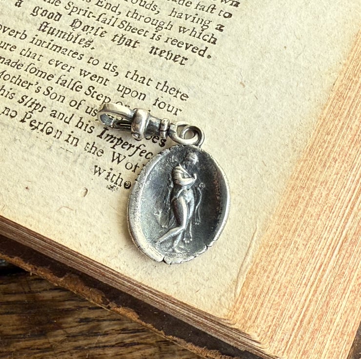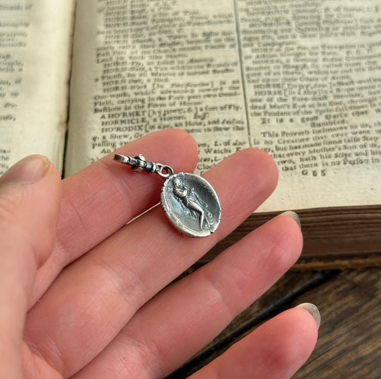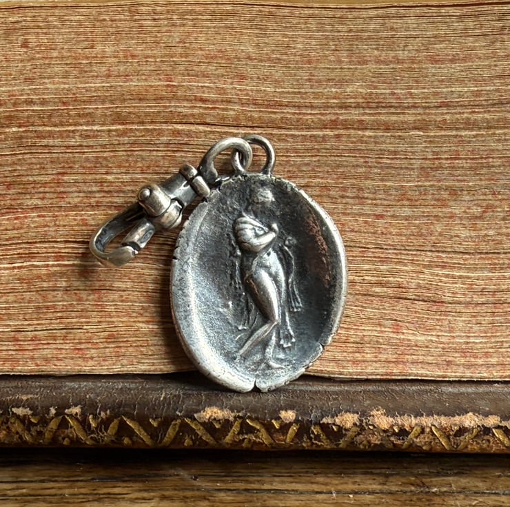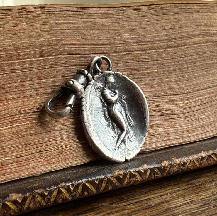 A double sided clip-on wax seal pendant/charm. Made from the impressions of two antique intaglios from Alex's beloved collection, featuring a classical female figure and a unique crest on the reverse. It is made in recycled sterling silver.